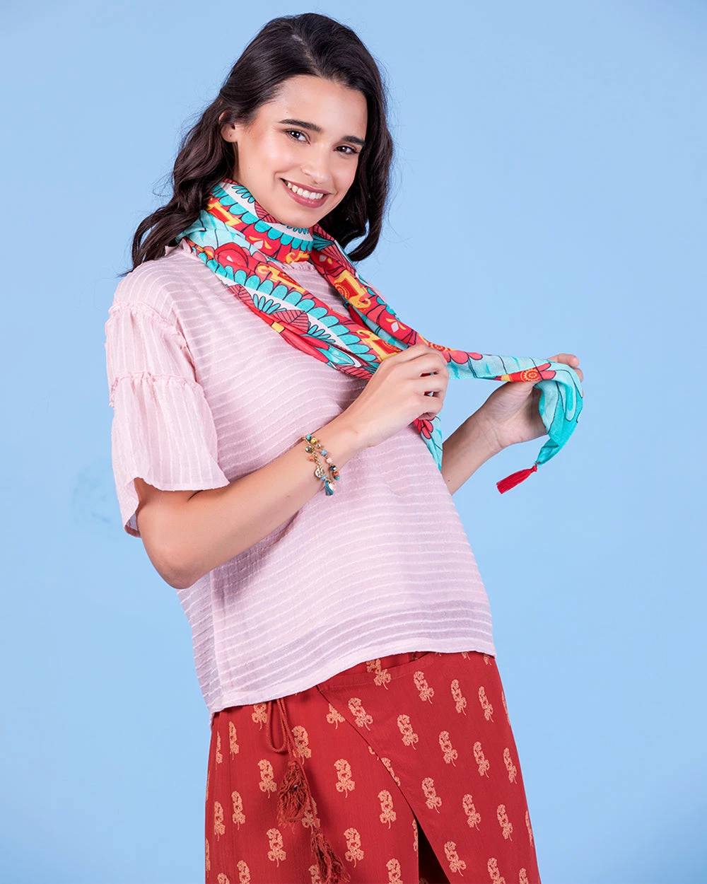 A vibrant boho add on to your look, this stunning scarf is perfect for gloomy winter days or windy spring evenings. Made in India & hand crafted from viscose to give you maximum comfort, this is a must have in your wardrobe.