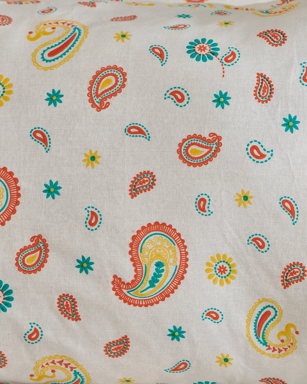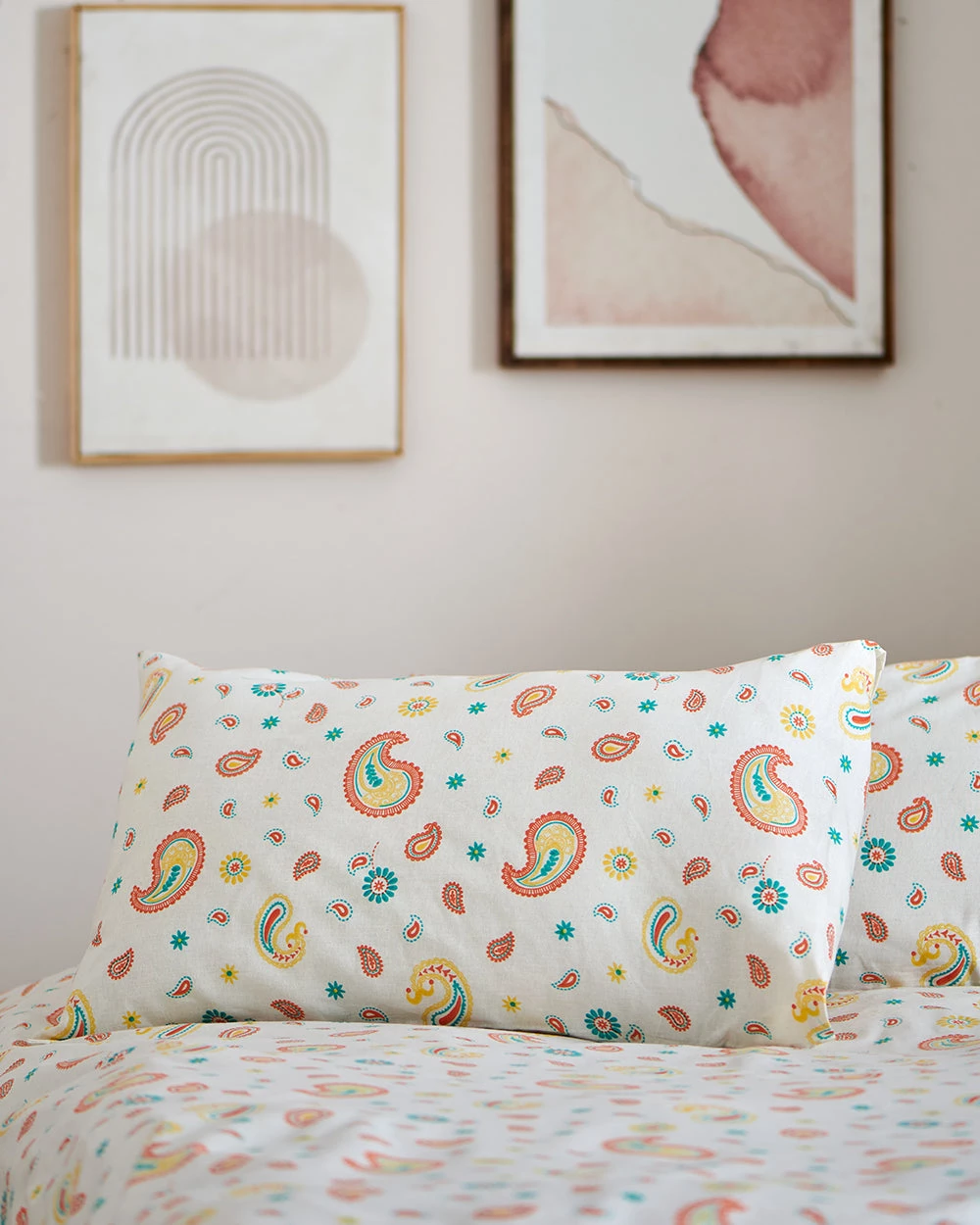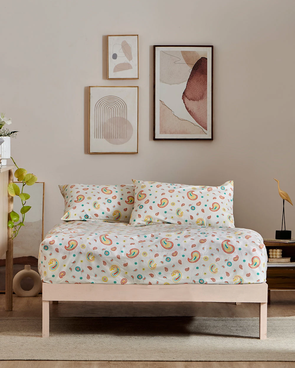 Snooze in style with our TEAL by Chumbak Cypress Paisleys Double Bedsheet Queen size. This set is made of 100% cotton and is a part of our TEAL by Chumbak range. This original Chumbak design features alluring paisley motifs all over and will look great in your bedroom. Pair it with our paisley-themed cushion covers. It measures 220 x 240 cms. Wash it separately, remove promptly after washing & dry. Tumble dry on low. Do not bleach. Iron if needed.