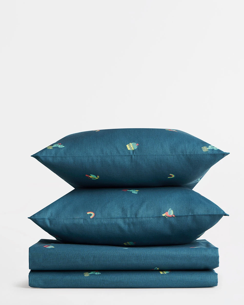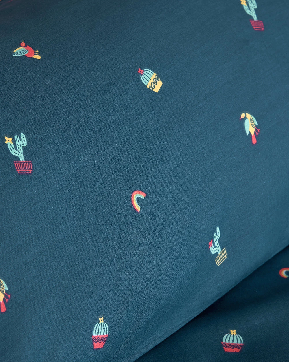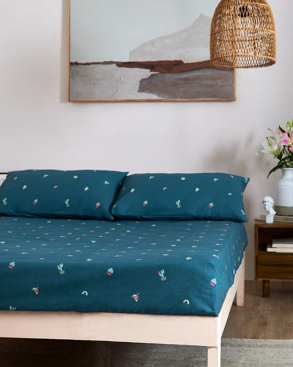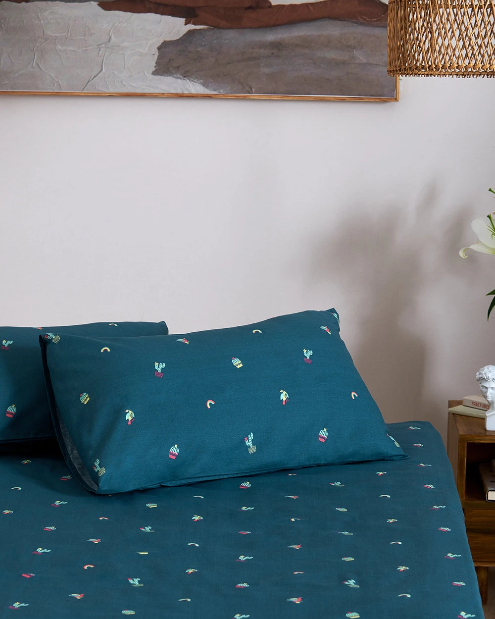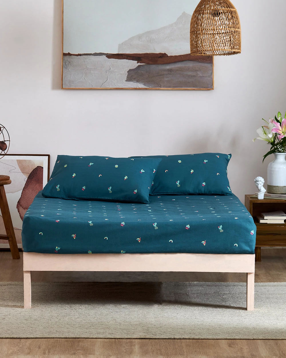 Snooze in style with our TEAL by Chumbak Sahara Desert Bedsheet Queen size. This set is made of 100% cotton and is a part of our TEAL by Chumbak range. This original Chumbak design features ditsy motifs all over and will look great in your bedroom. Pair it with our exquisite range of cushion covers. It measures 220 x 240 cms. Wash it separately, and remove promptly after washing & dry. Tumble dry on low. Do not bleach. Iron if needed.