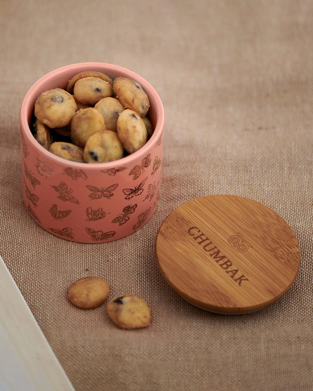 Store your favourite snacks in this ceramic jar which will remind you to enjoy them to the fullest while you devour them. A feel-good addition to your kitchen this pink and gold printed jar with an airtight wooden lid is Ideal for storing dry nuts, biscuits, tea leaf etc. These are dishwasher safe.