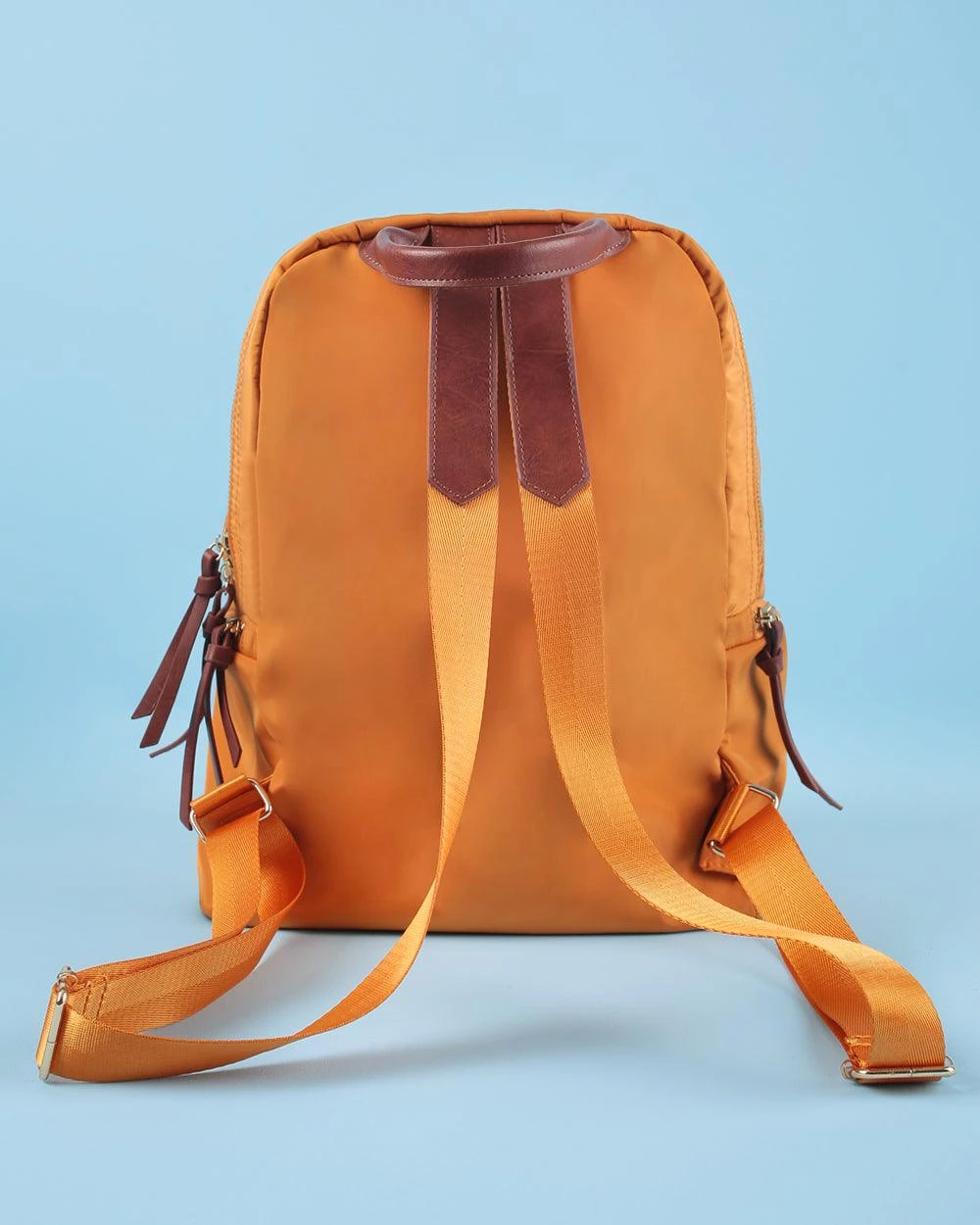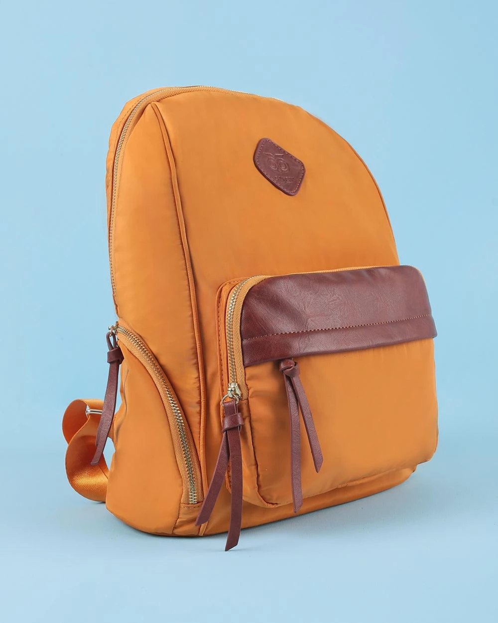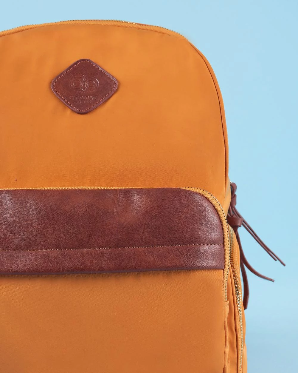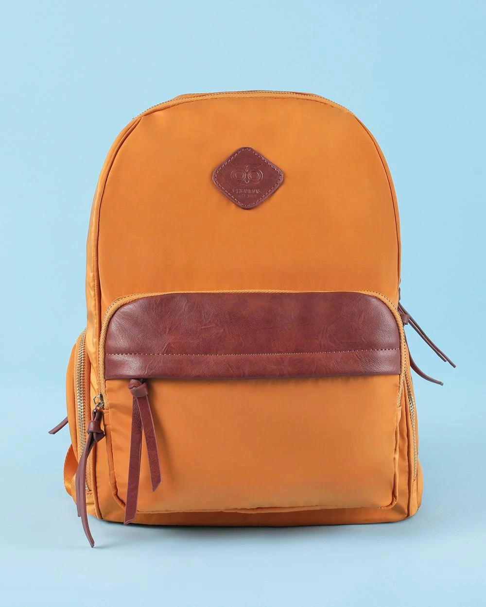 This solid classic Chumbak Mustard backpack with faux leather detailing with the classic owl mnemonic is perfect for work or travel! The stunning mustard shade pairs well with any denim outfit. This backpack comes with a nylon, PU, and polyester lining which makes it easy to maintain and carry. It includes an outer front pocket, two side pockets, a haul loop, and adjustable shoulder straps.