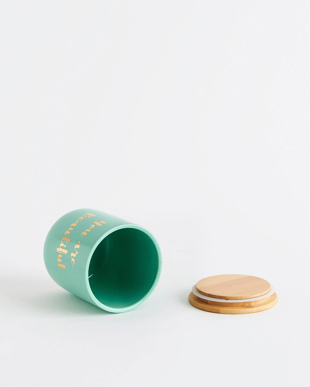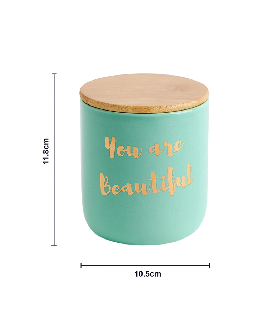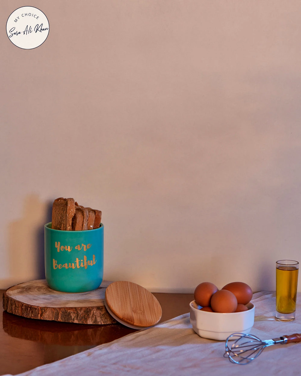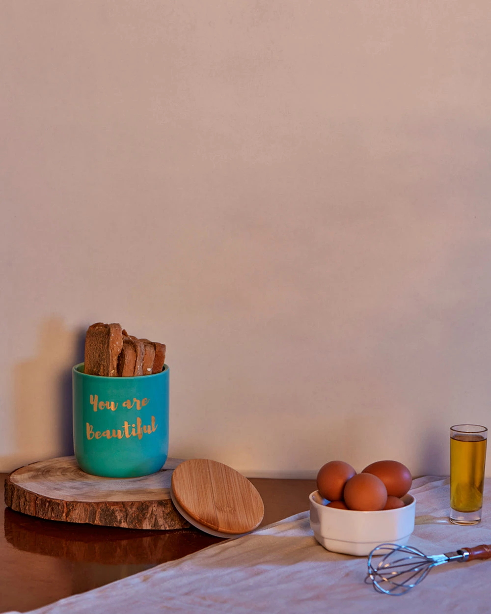 You will love going to your snack jars not only because of all the yummy goodies they store but also for the positive vibes. A beautiful teal ceramic jar with “You are beautiful” written in gold, it comes with an airtight lid made of bamboo. Perfect for storing your tea time favourites like dry nuts, biscuits, teas, etc., it is also microwave safe.