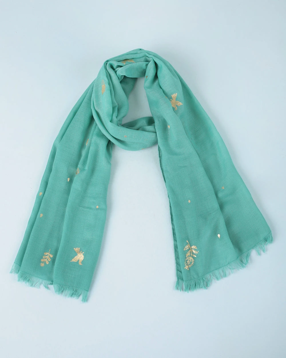 This lovely solid teal scarf peppered with embossed gold patterns and a fringe rim is pairs perfects with a crisp white or ivory shirt. Made in India & hand crafted from viscose to give you maximum comfort, this is a must have in your wardrobe.