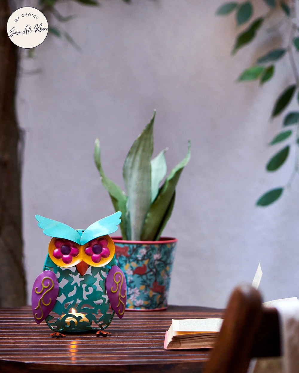 Boho meets vintage in this extraordinary tealight holder. Fashioned from distressed finish iron, this original Chumbak design has cutouts to let just the right amount of light shine through and create interesting shapes in your living space. The mighty owl with flowers for eyes and a colourful disposition adds quirk.