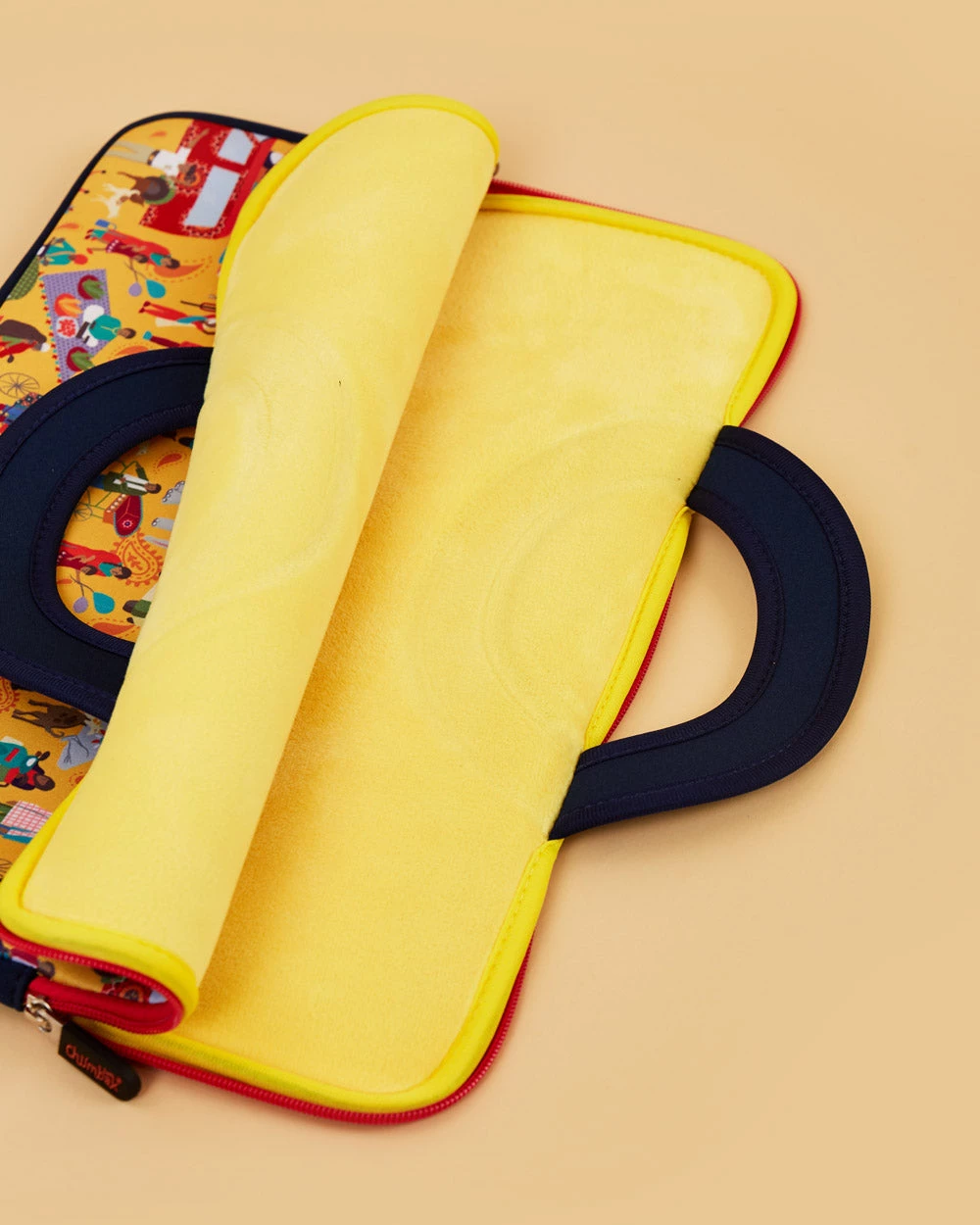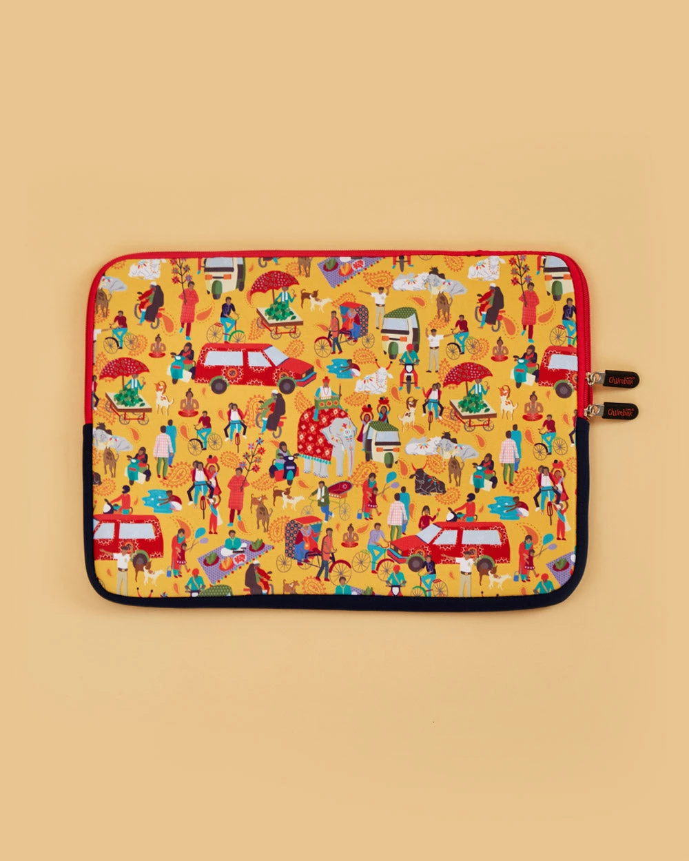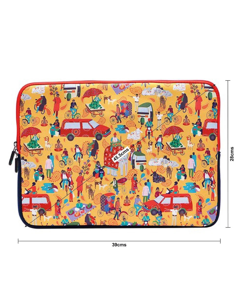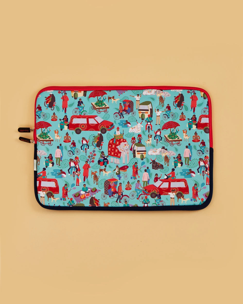 Being stuck in traffic was never this colorful! Our Indian Traffic 15.6″ Laptop Sleeve has an original Chumbak design in bright colors that will keep those compliments coming. Made from Neoprene and a Fluff Lining, it will keep your laptop safe, dry, and scratch-free. It is spacious and sturdy enough to hold laptops with screen sizes up to 15.6″. Its two handles make it easy to carry around and can be tucked inside when unused. [Disclaimer: May not accommodate laptops with large bezels, please check dimensions against laptop dimensions.]