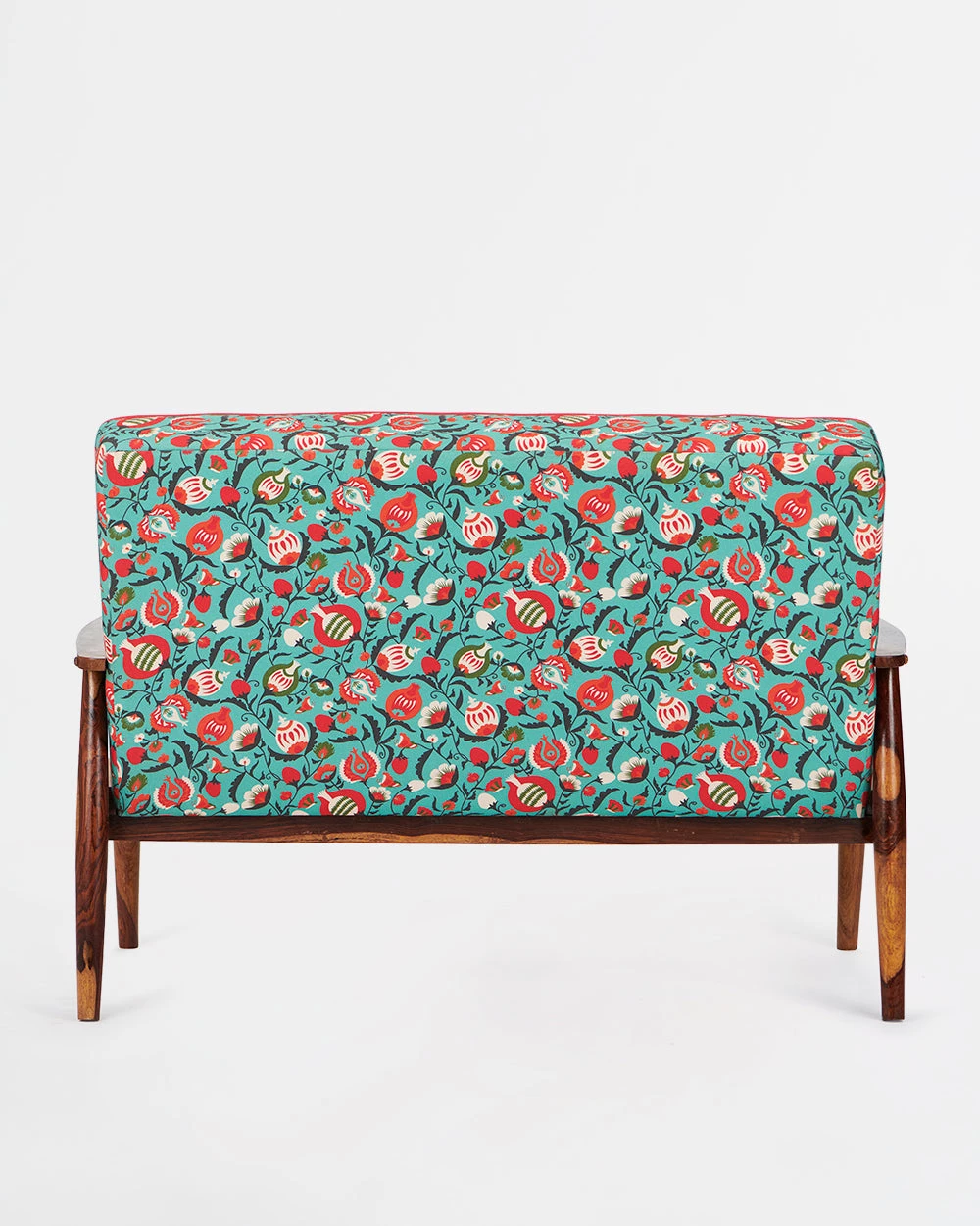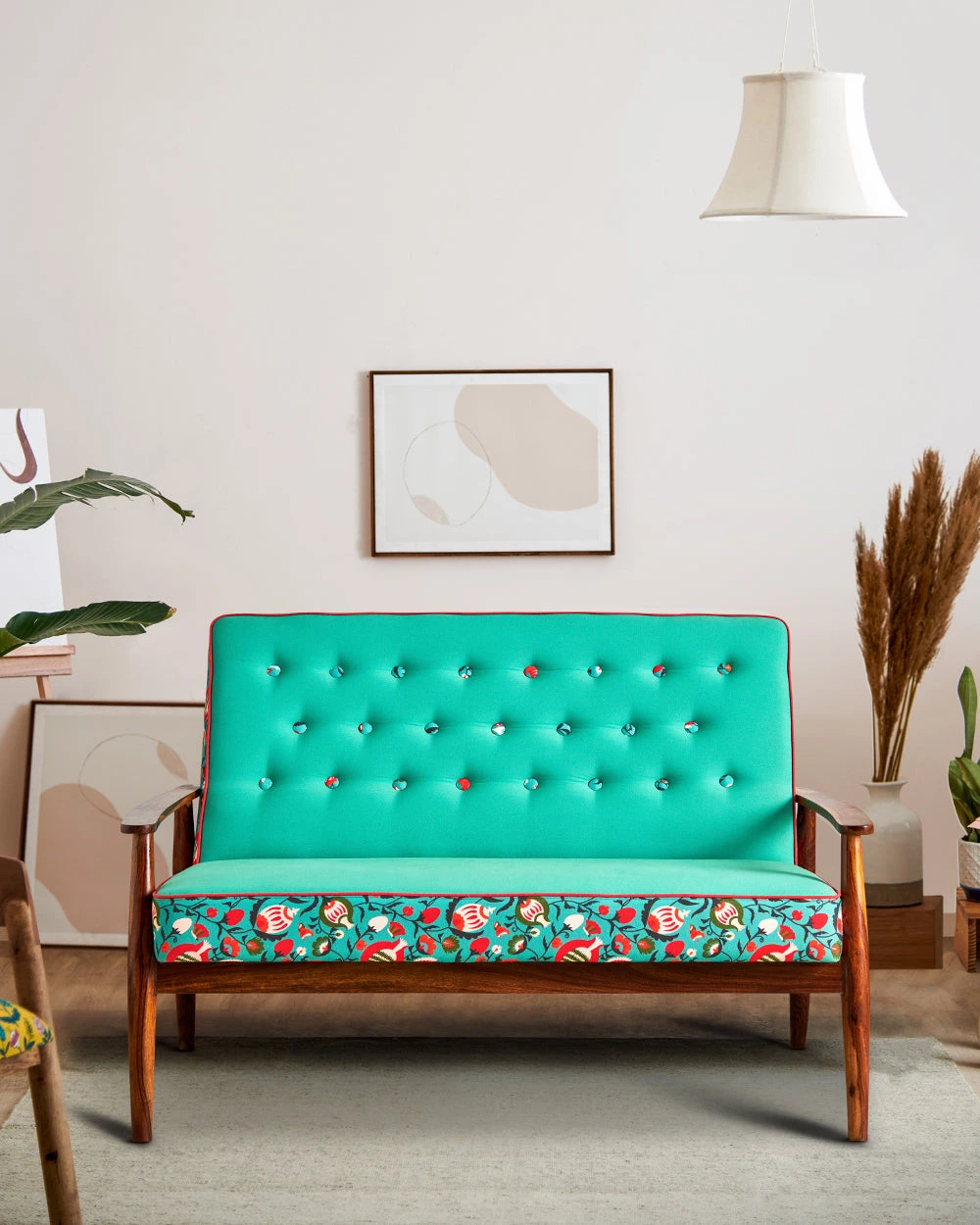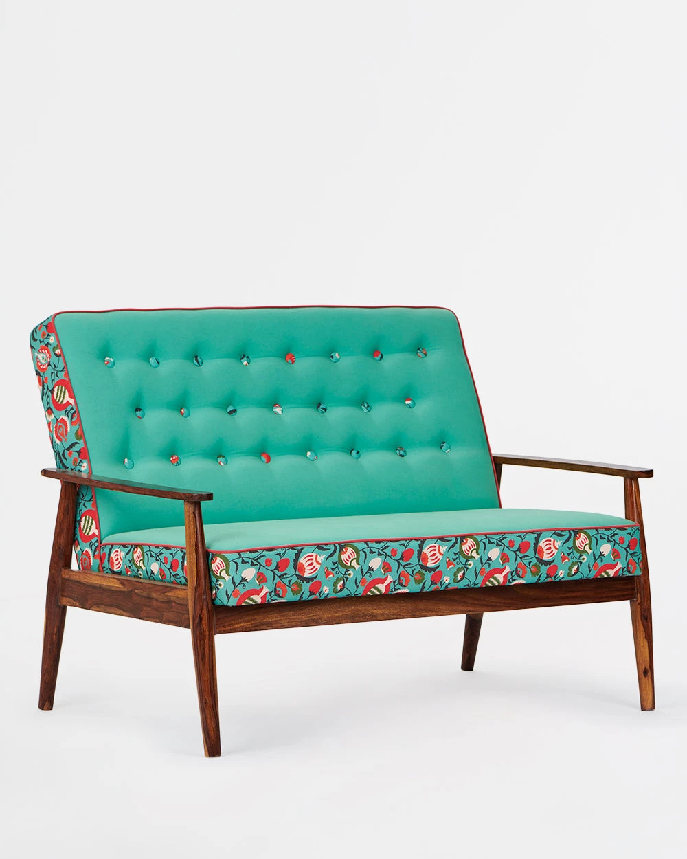 Our Memsaab Loveseat – 2 Seater, Tuffted Teal is inspired by mid-century modern style of furniture. It features durable sheesham legs and is upholstered with high-density foam for utmost comfort and durability. You can place this armchair in your hall, balcony for a casual sit out, in your bedroom corner or next to your bed. You can also create a relaxing work from home corner by placing this armchair and pairing it up with our begum foot rest.