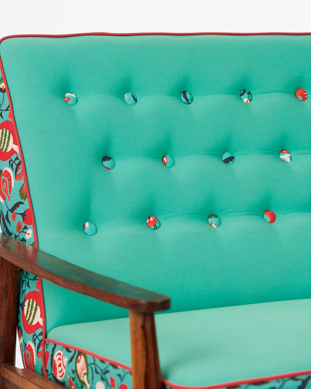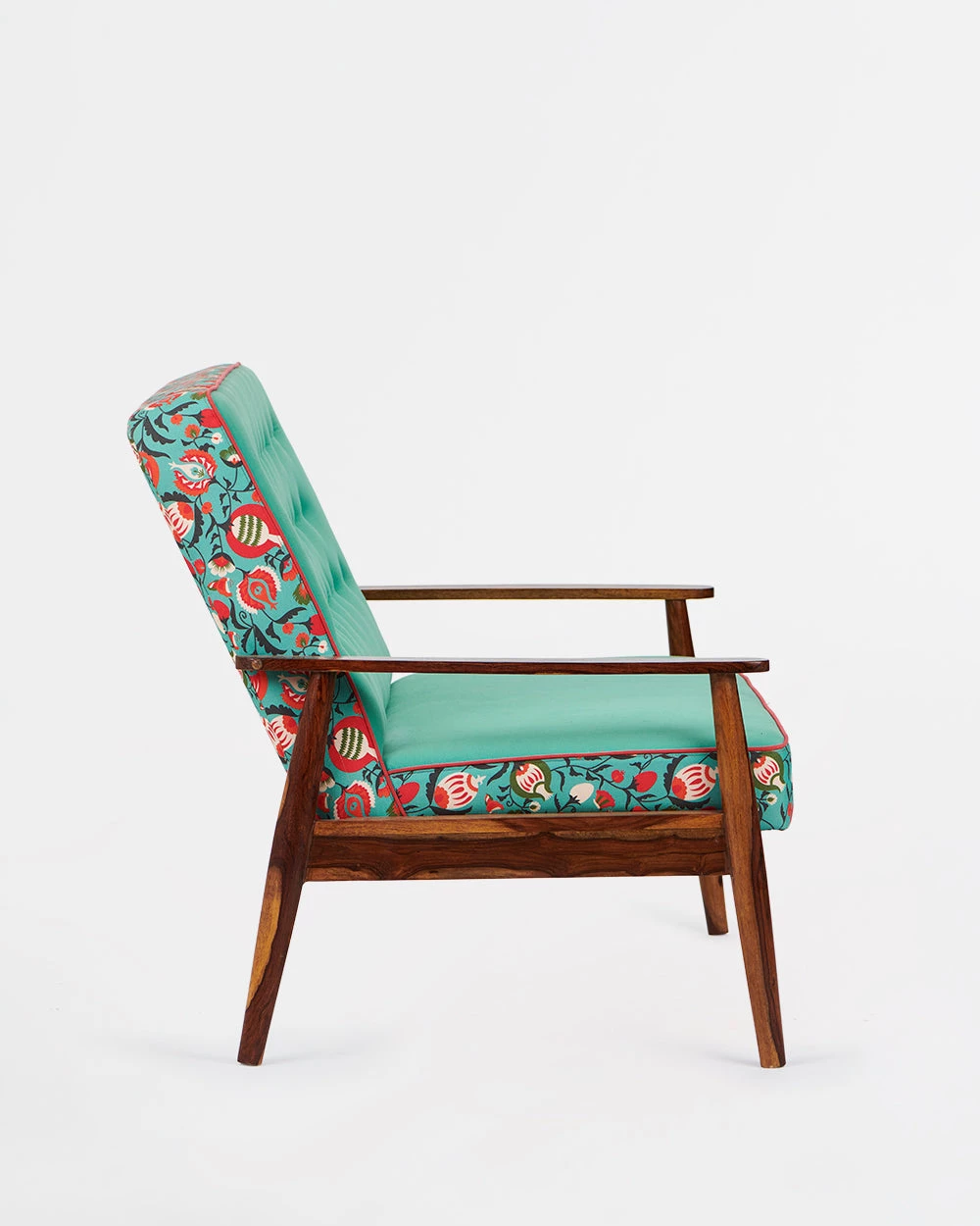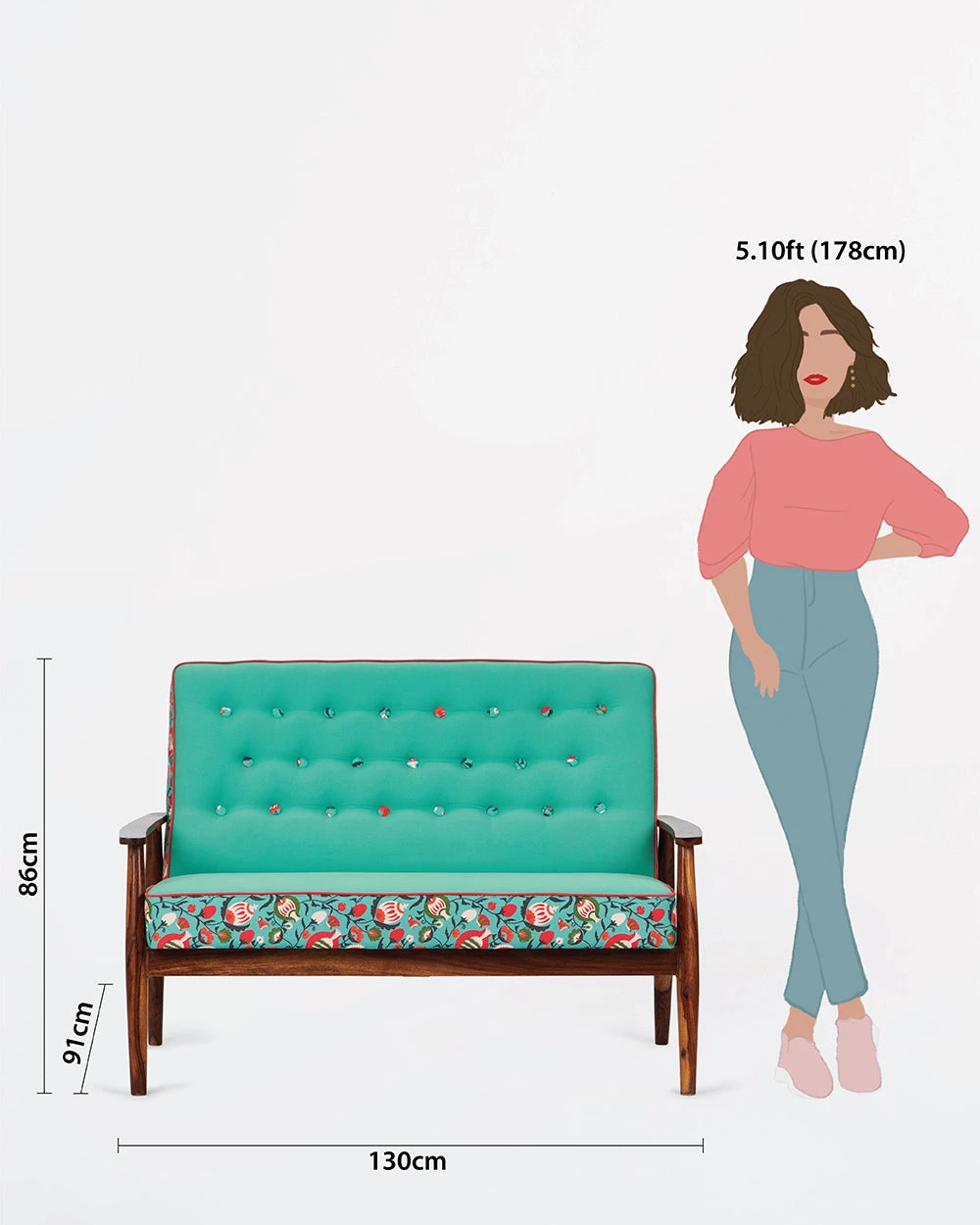 Our Memsaab Loveseat – 2 Seater, Tuffted Teal is inspired by mid-century modern style of furniture. It features durable sheesham legs and is upholstered with high-density foam for utmost comfort and durability. You can place this armchair in your hall, balcony for a casual sit out, in your bedroom corner or next to your bed. You can also create a relaxing work from home corner by placing this armchair and pairing it up with our begum foot rest.