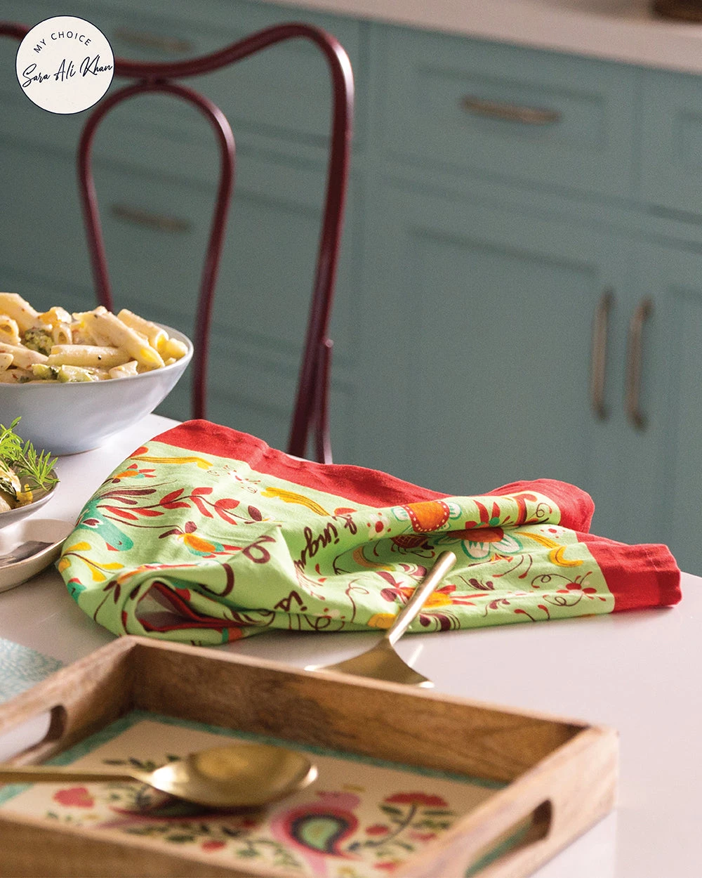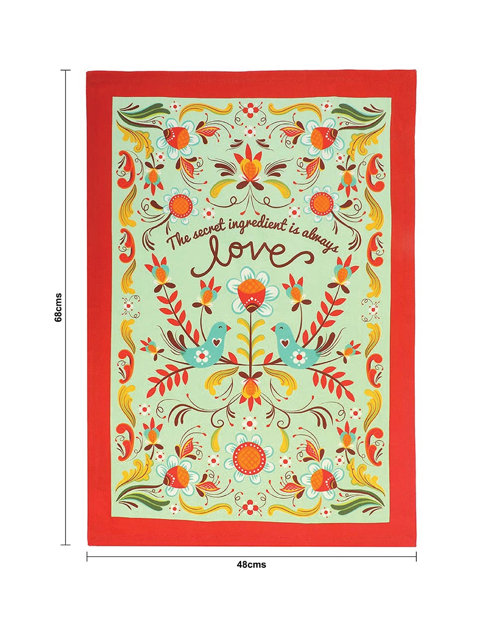 Add this cute tea towel to your kitchen for some extra vibrancy and love! Made from cotton, this original Made in India print comes with an attached cloth strip, and can be kept handy while cooking, chopping, or baking!