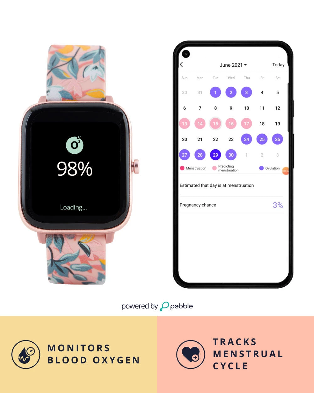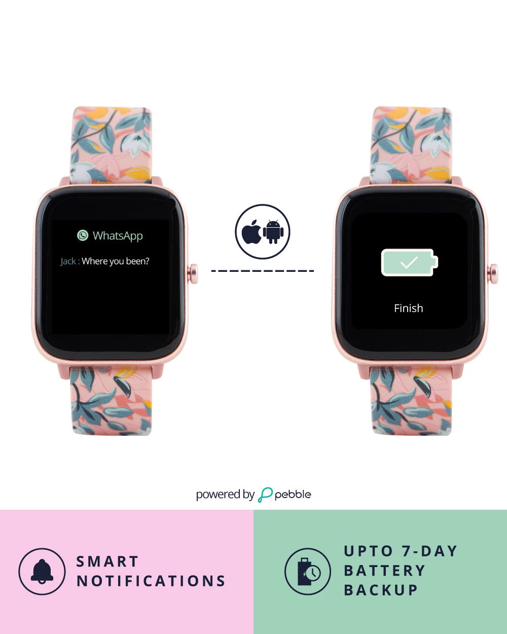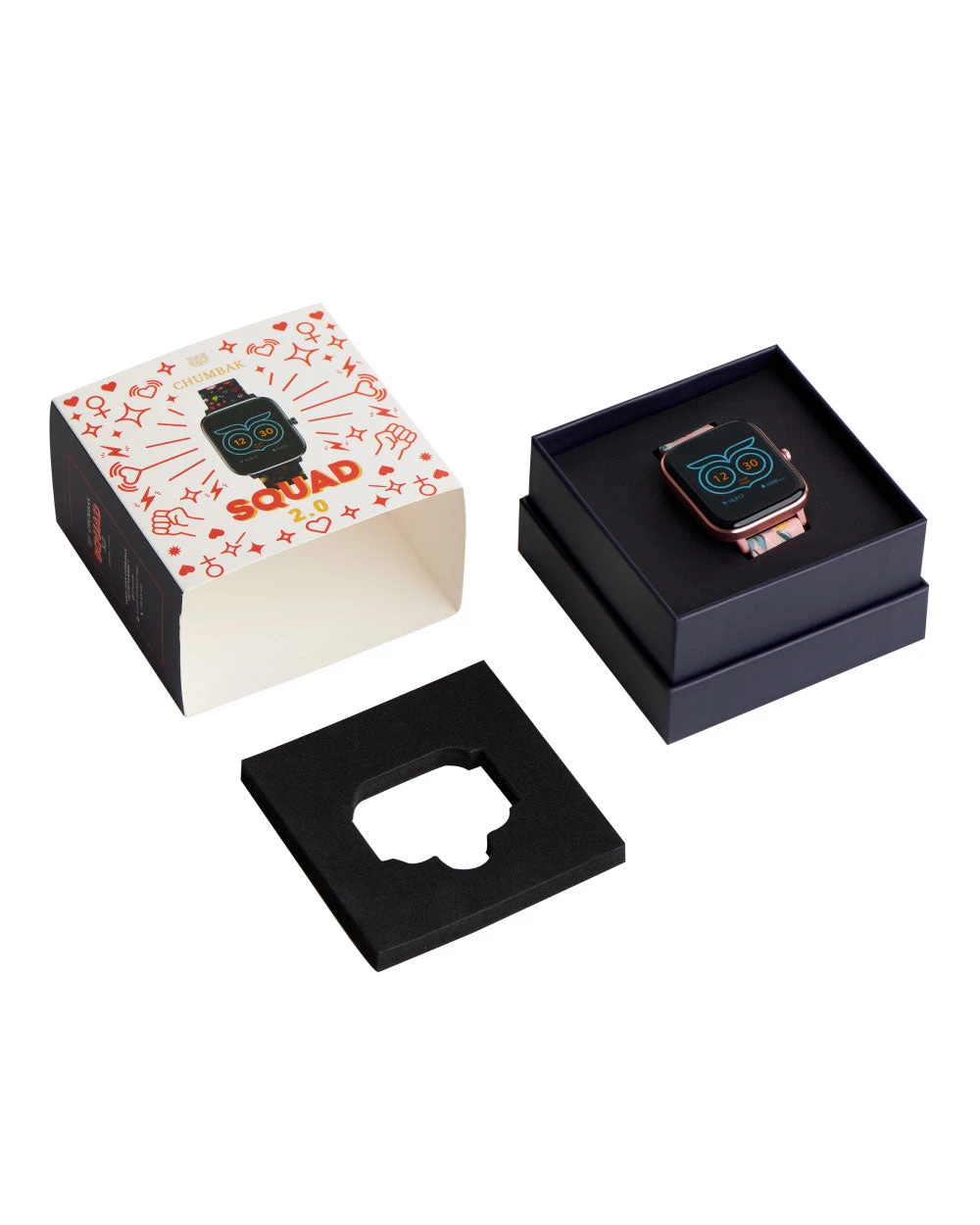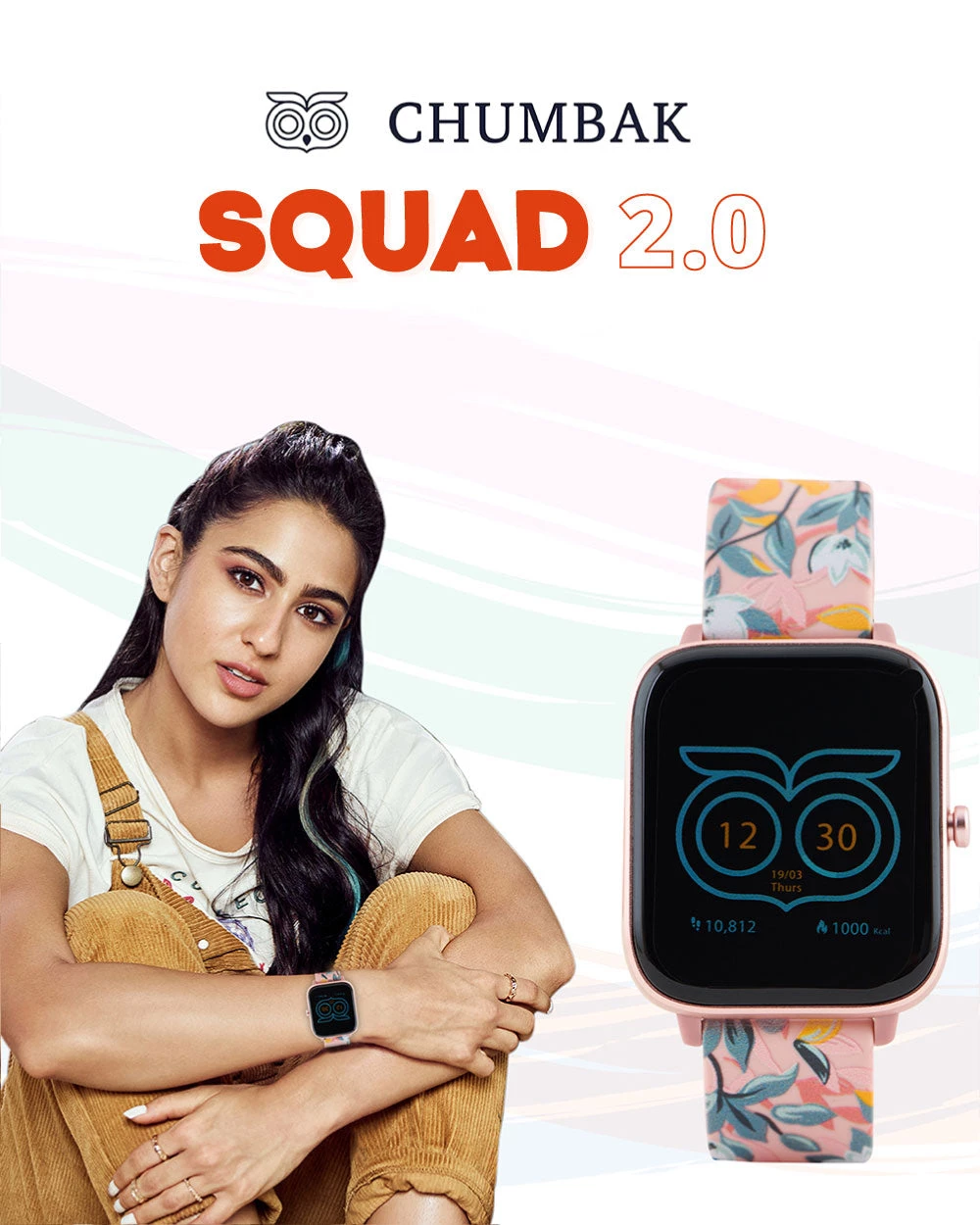 Kickstart your fitness journey with Chumbak Squad 2.0 Smartwatch. This Squad 2.0 Smartwatch- Sunshine State by Chumbak powered by Pebble comes in 4 iconic original Chumbak Bands, a 1.7′ full touch screen with dynamic display and full touch control along with 100+ Watch faces. A cut above the rest, it offers real time health monitoring, continuous blood oxygen monitoring, tracks menstrual cycle, monitors sleep quality, continuous heart rate & blood pressure tracking. With a step pedometer, it monitors your calorie burn for 7 sport modes- walking, running, cycling, skipping, badminton, basketball, football & calorie burnt monitoring. It provides seamless sync with WhatsApp, EMAIL, SMS, social media, call notification, google fit app and music control. The powerful 230 mAh battery along with the advanced smart sensors give the Chumbak Squad a massive stand by battery backup of 14 days along with 7 days of active use. Chumbak Squad is sweat & water-proof.
