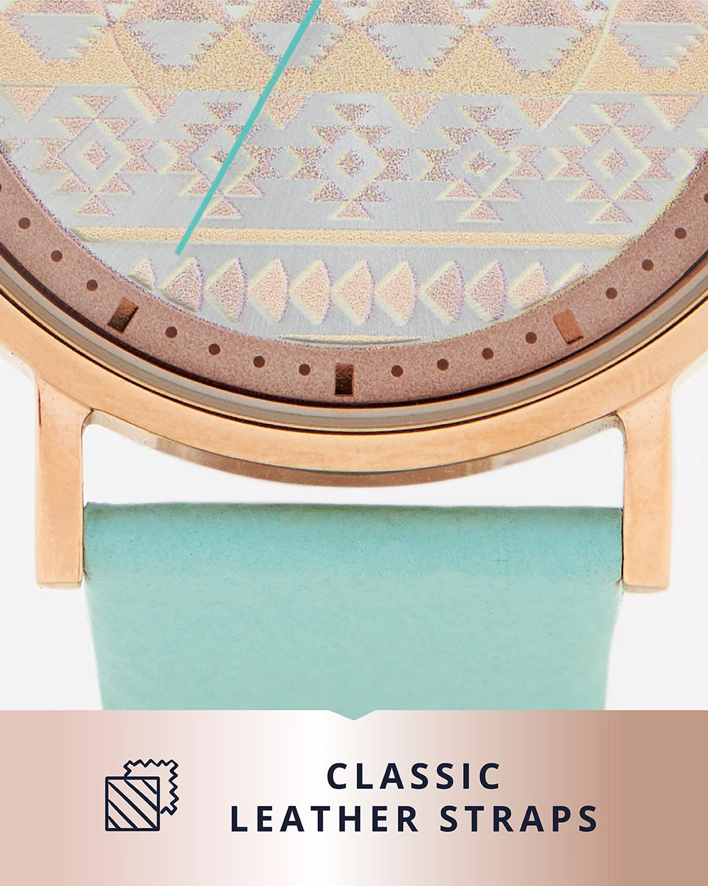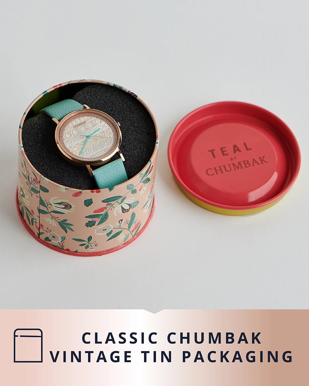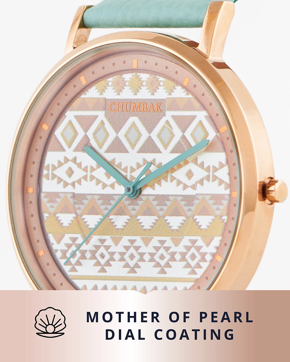 Crafted for a joyful everyday, our Stainless Steel Aztec Affair Watch from Chumbak will adorn your wrist like a dream. The mother of pearl dial and the colorblock needles gives an uptown look and feel to the watch. The 35mm rose gold case and the printed leather strap makes it an apt pick for the modem woman of today. Our watches come in a joyful vintage tin packaging, perfect for gifting.