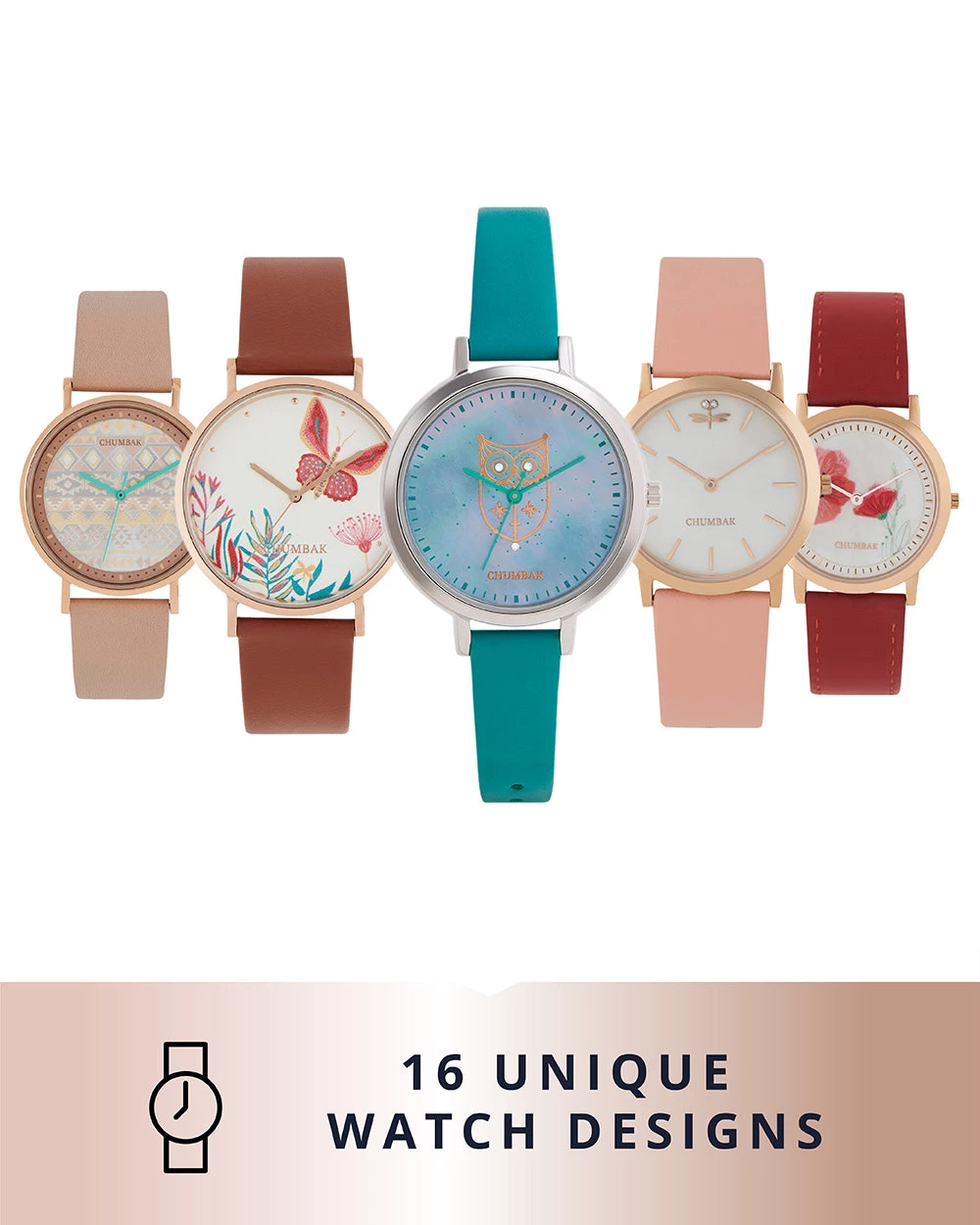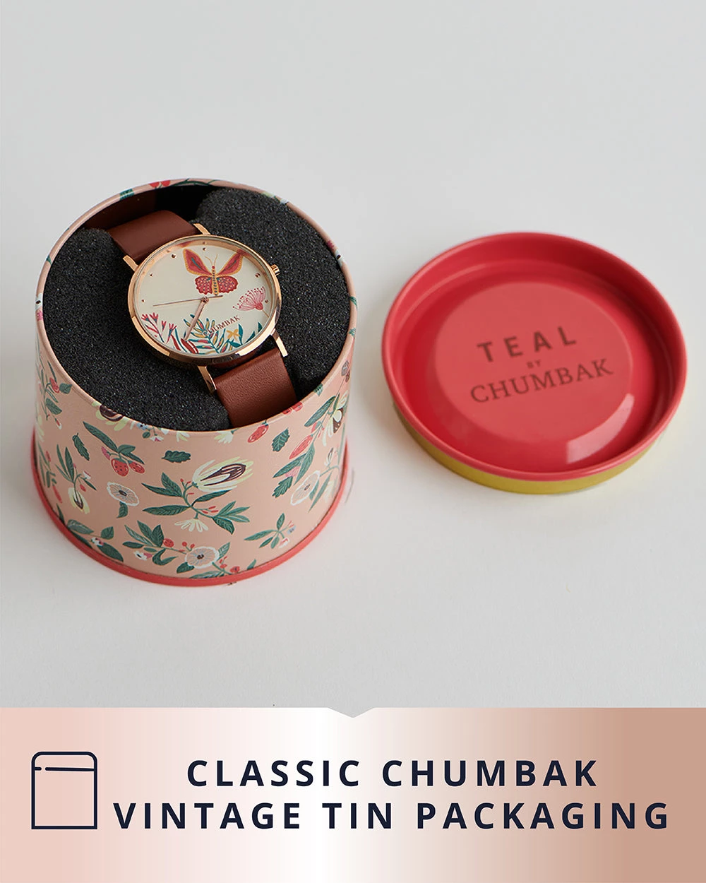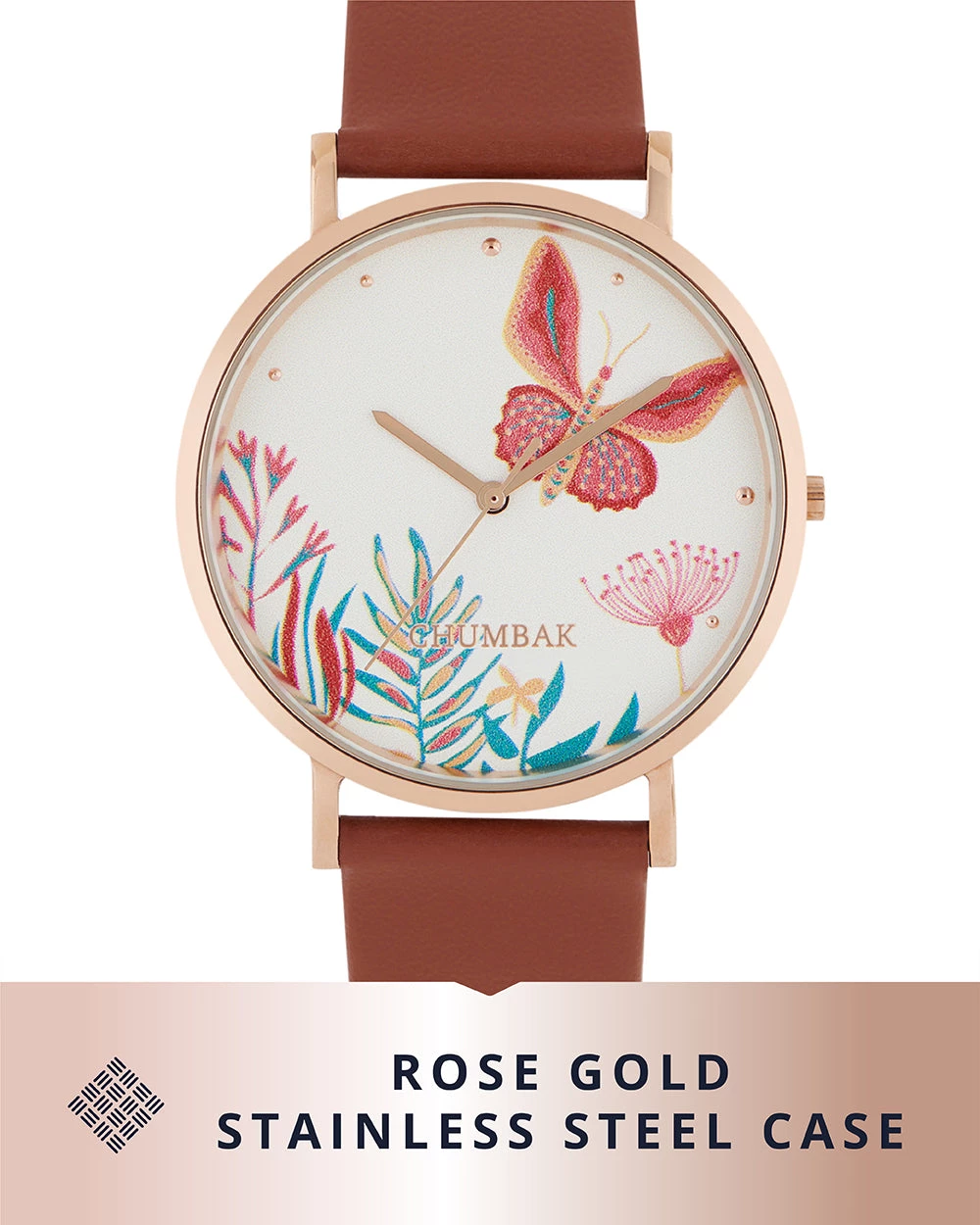 Crafted for a joyful everyday, the Stainless Steel Butterfly Watch from Chumbak will adorn your wrist like a dream. The mother of pearl dial and the colorblock needles gives an uptown look and feel to the watch. The 35mm Rose Gold case and the printed leather strap makes it an apt pick for the modem woman of today. Our watches come in a joyful vintage tin packaging, perfect for gifting.