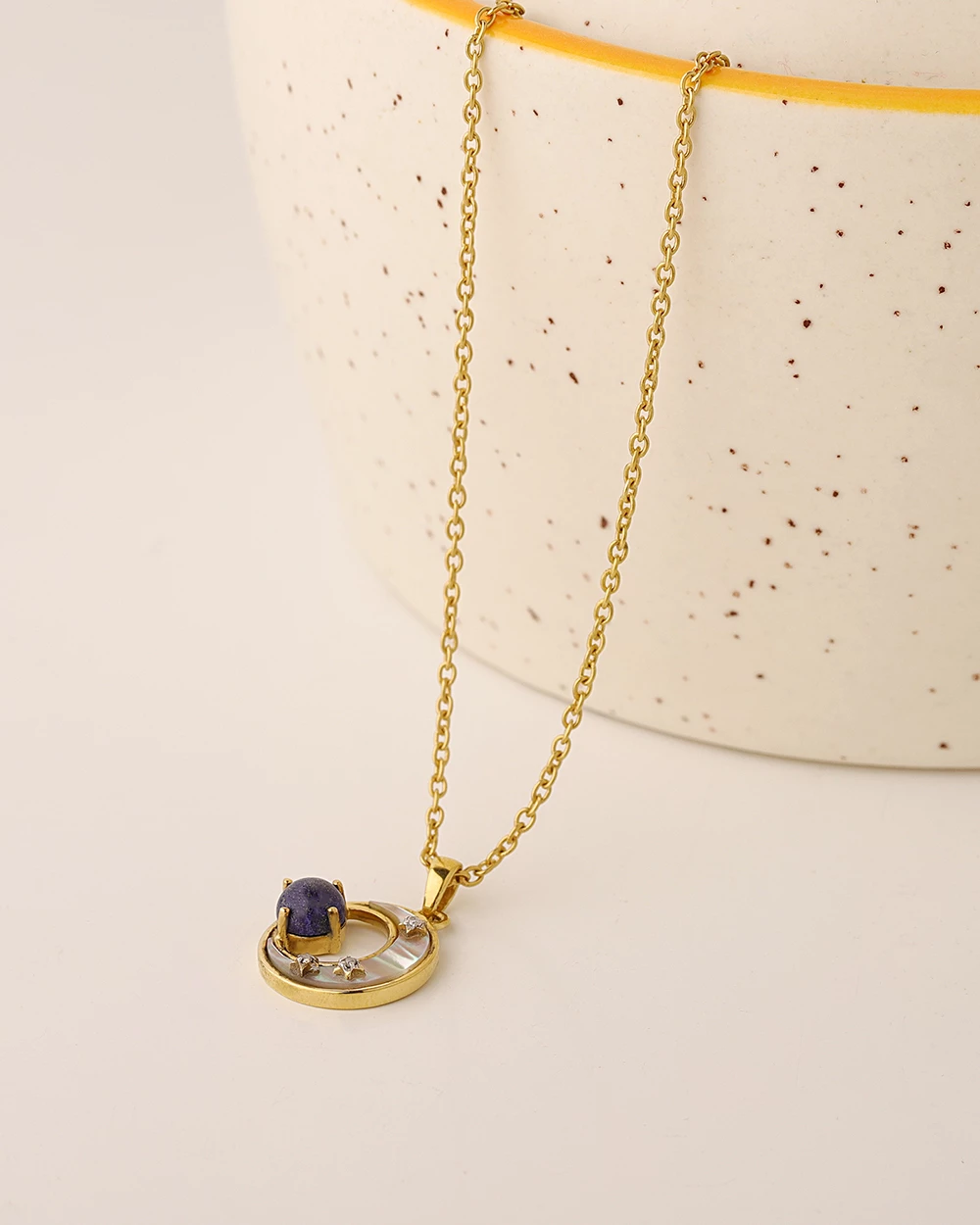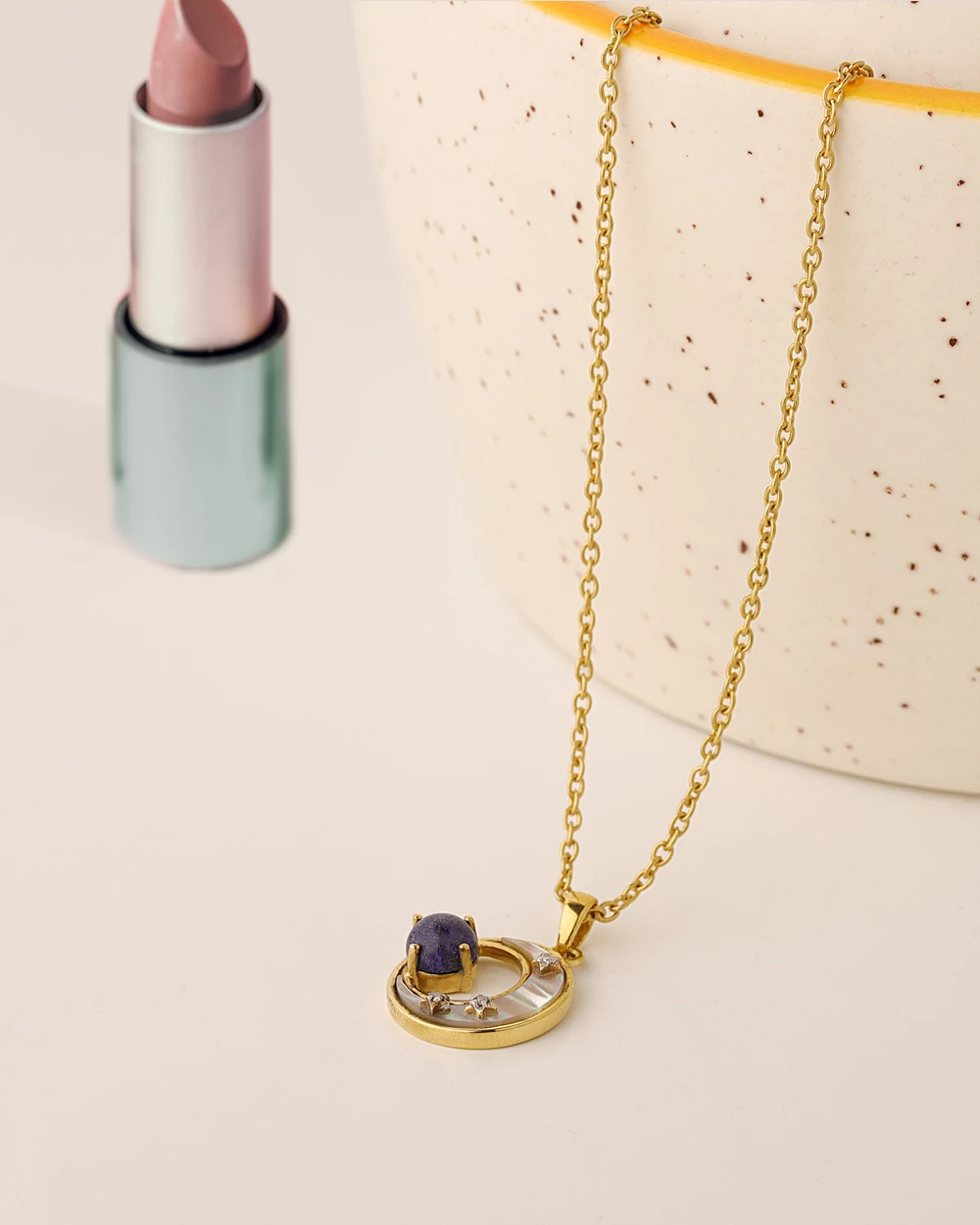 Our Celestial range of jewllery is a dreamy compilation of handcrafted pieces. The Starry Starry Nights necklace is no different, with its mother of pearl pendant encrusted with diamonds and a lapis lazuli sphere at the ends of the half-moon. The design evokes images of romance and whimsy and makes for a memorable gift. Include this understated yet elegant trinket in your repertoire, and you can wear it with everything in your wardrobe.