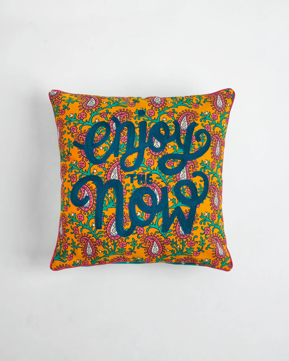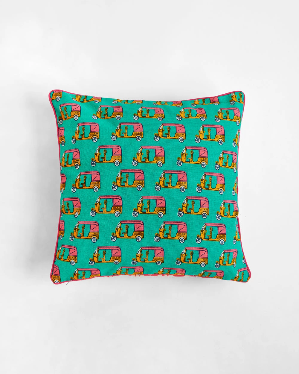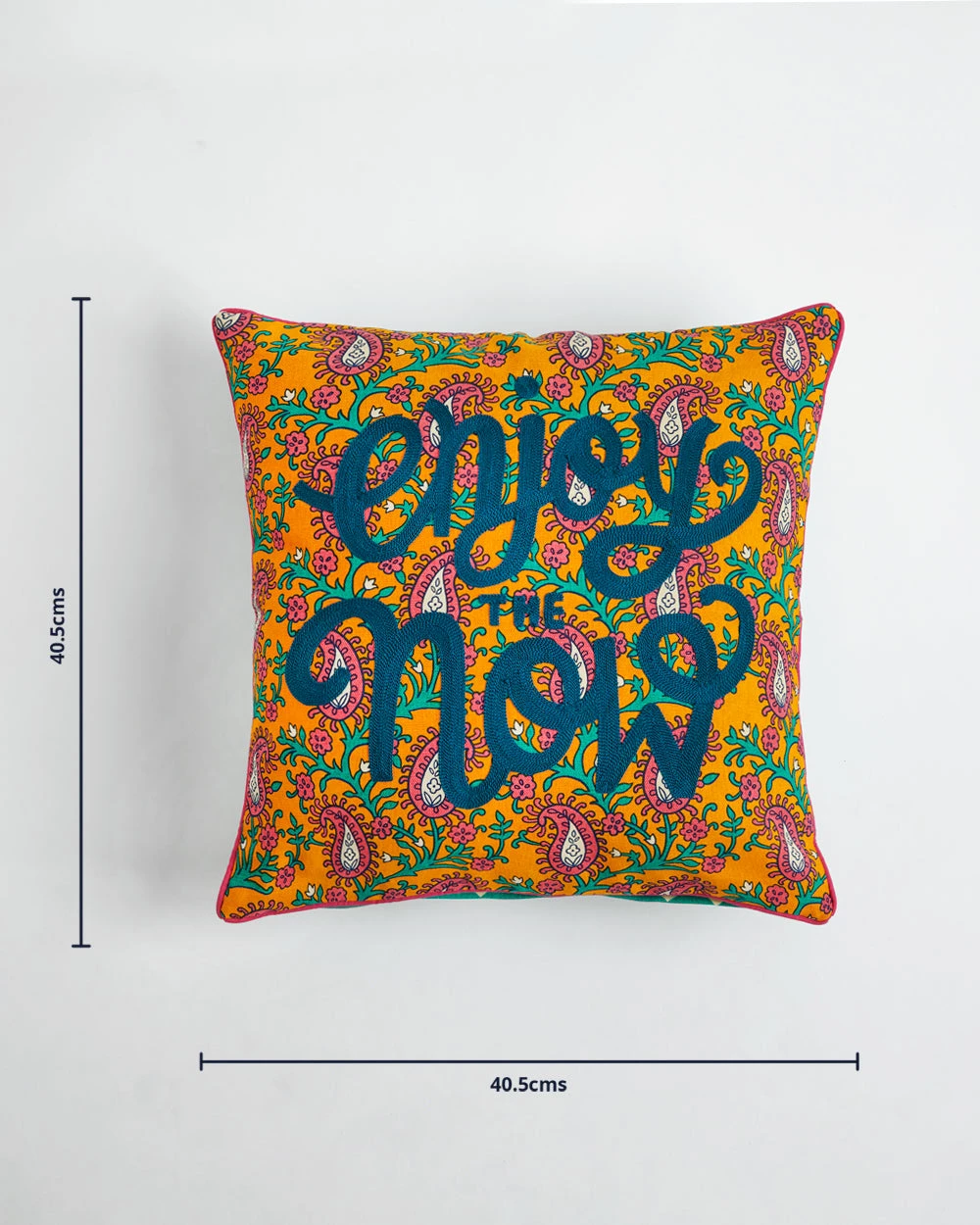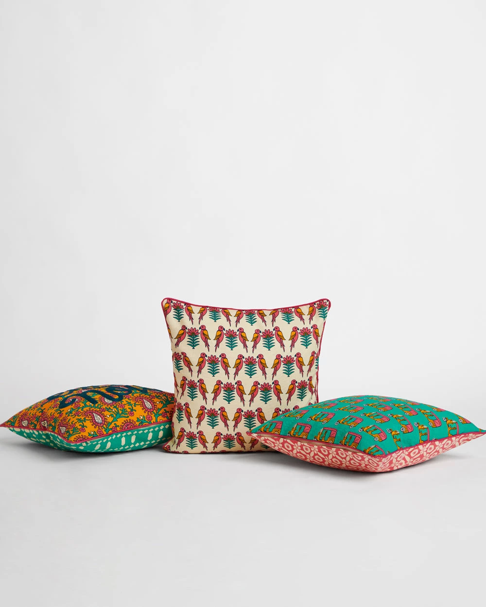 A set of 3, this combo of block print style cushion covers is an ode to the ancient art form synonymous with India. Featuring prints both vintage and modern it will help you decorate your home whichever mood you are in. It consists of 16″ cushion covers with an autorickshaw, parrot and a floral print which reads “Enjoy the Now”.