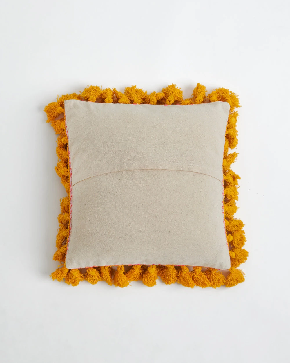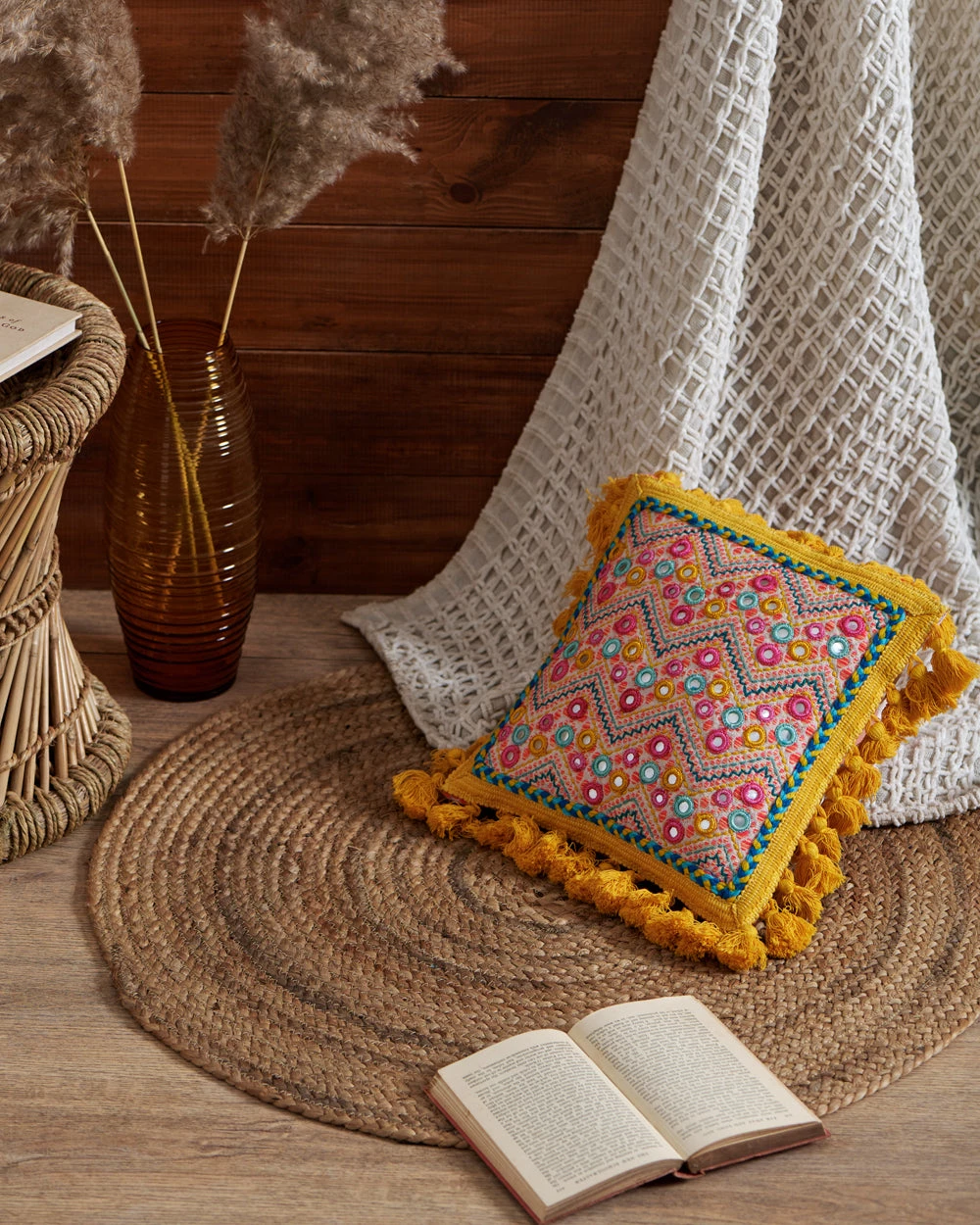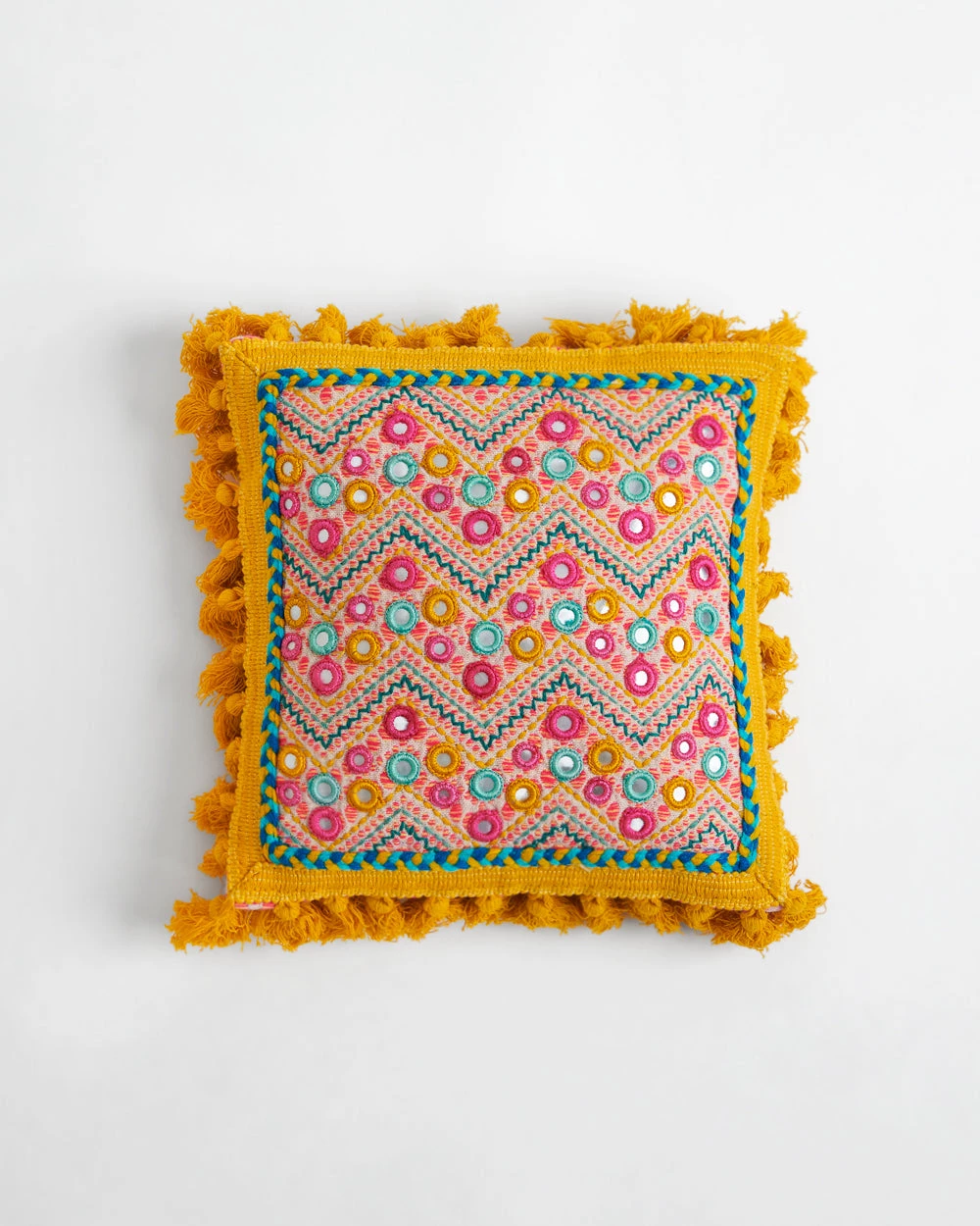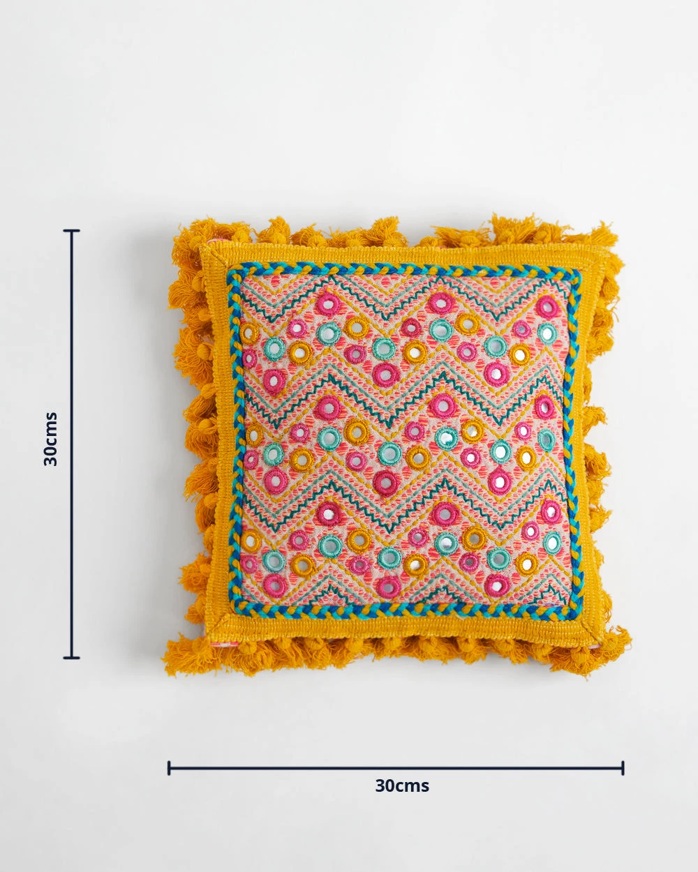 The Sunshine Square Cushion Cover is a love letter to the intricate crafts of the Kutch region of India. This happy medley of colours and textures is a definite mood lifter and will add cheer to all your soirees. Sunny yellow tassels with embroidered Chevron stripes and mirror work detail makes it a true masterpiece. Add a few of these to a dull corner and watch it brighten up instantly!