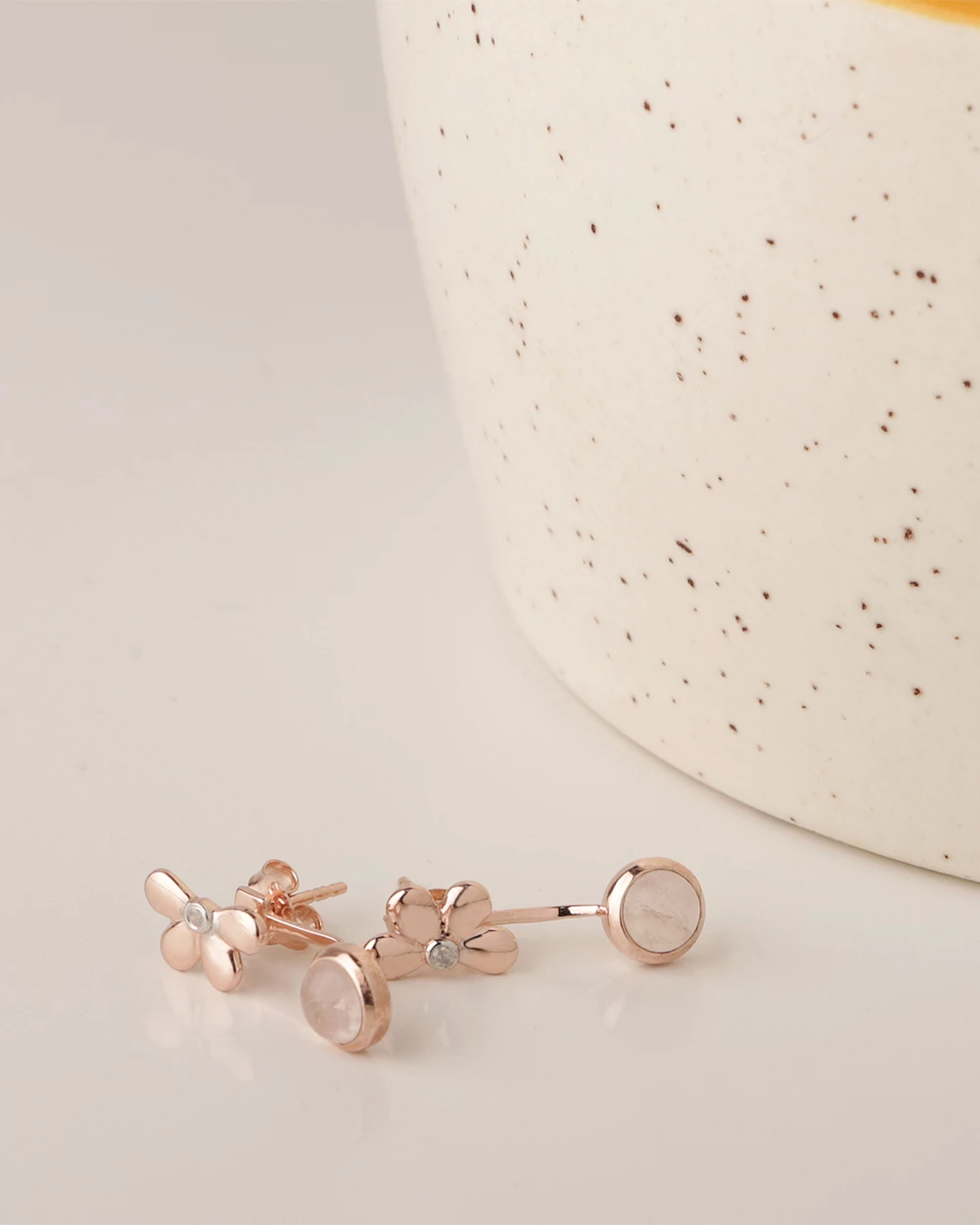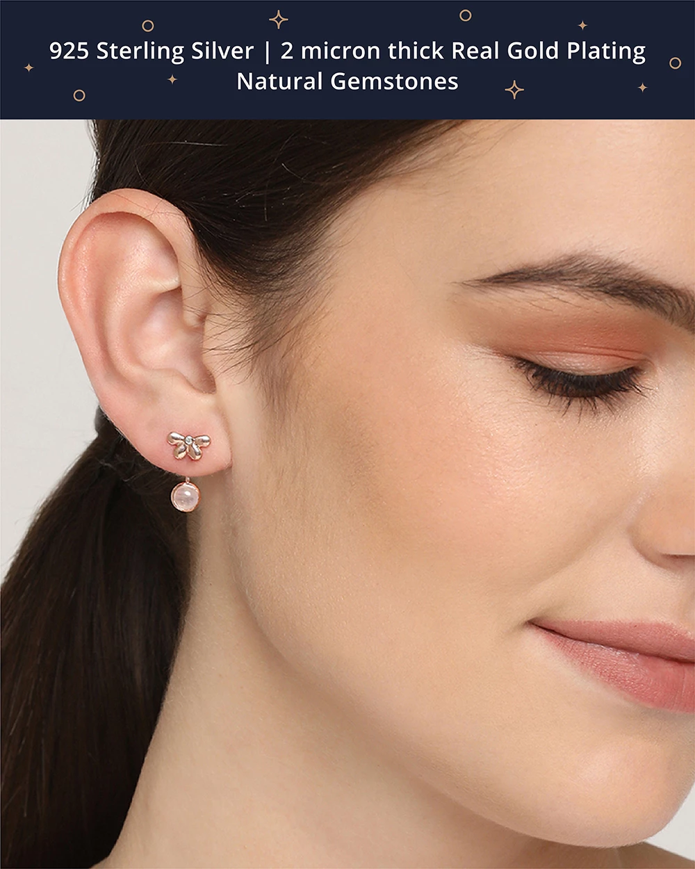 Our Take a bow Studs are all things contemporary. Pretty bows are paired with dusty pink Rose Quartz on a curved body to create this gold-toned number. Take a Bow earrings are for the minimalist girl. Perfect to be paired with formal or casual outfits, this piece of jewellery fits right in!
