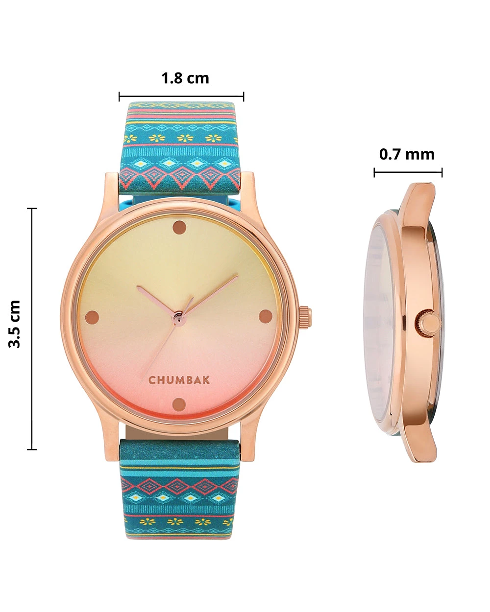 An original Chumbak design, our TEAL by Chumbak Aztec-inspired print on the strap clubbed with a gorgeous ombre dial pairs well with everyday looks. Crafted from PU and powered by a quartz mechanism – this watch is perfect for everyday use. Our watches come in a joyful vintage tin packaging, perfect for gifting.