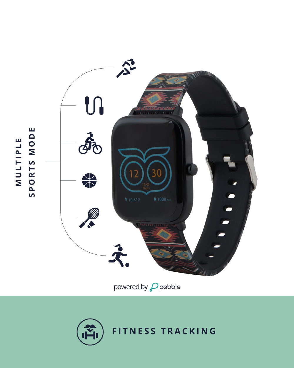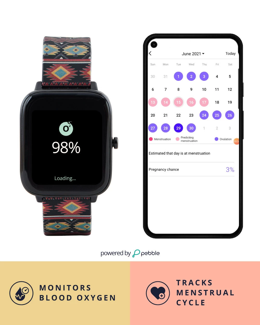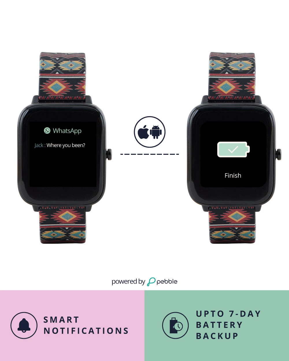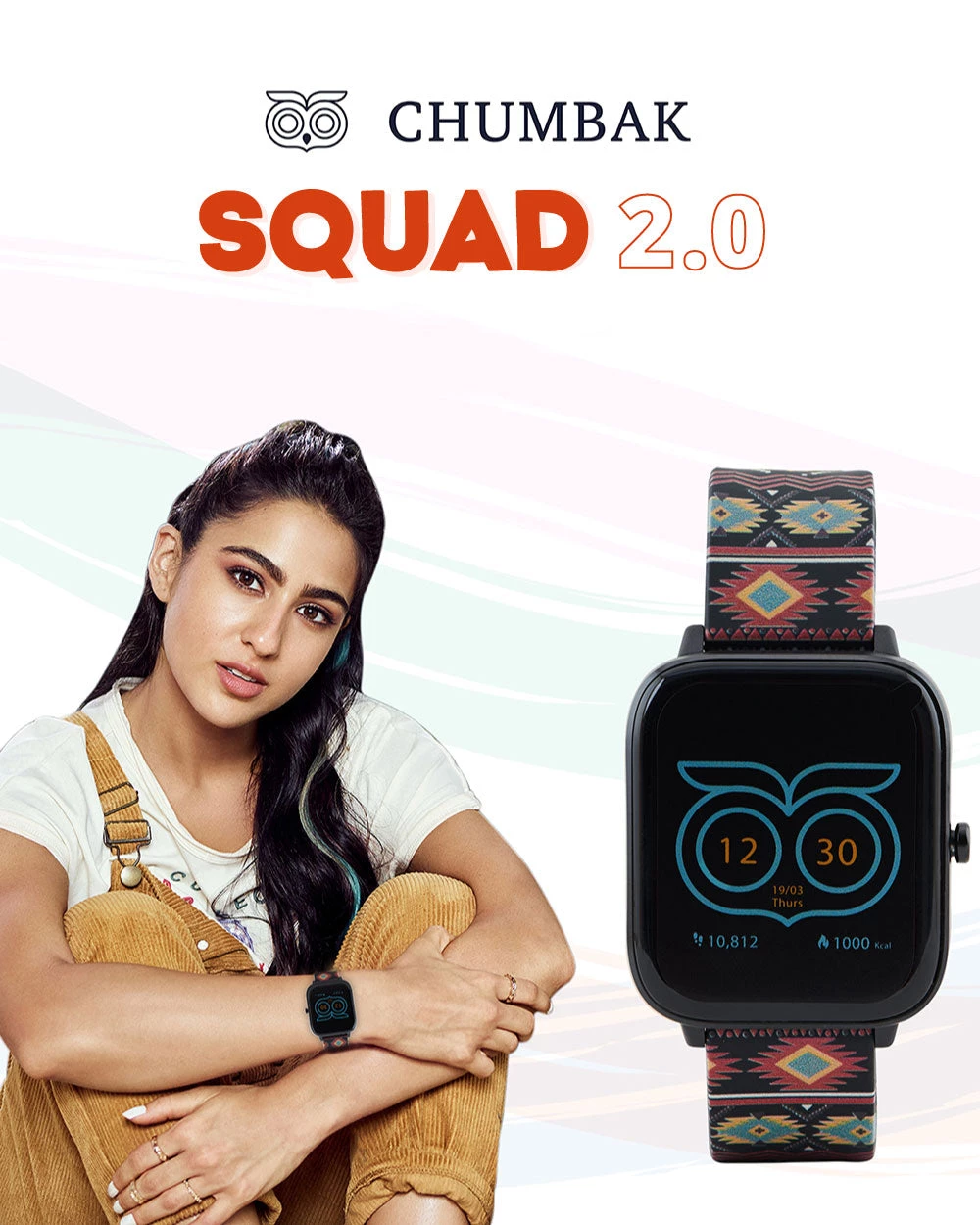Kickstart your fitness journey with Chumbak Squad 2.0 Smartwatch. This Squad 2.0 Smartwatch- Aztec Marvel by Chumbak powered by Pebble comes in 4 iconic original Chumbak Bands, a 1.7′ full touch screen with dynamic display and full touch control along with 100+ Watch faces. A cut above the rest, it offers real time health monitoring, continuous blood oxygen monitoring, tracks menstrual cycle, monitors sleep quality, continuous heart rate & blood pressure tracking. With a step pedometer, it monitors your calorie burn for 7 sport modes- walking, running, cycling, skipping, badminton, basketball, football & calorie burnt monitoring. It provides seamless sync with WhatsApp, EMAIL, SMS, social media, call notification, google fit app and music control. The powerful 230 mAh battery along with the advanced smart sensors give the Chumbak Squad a massive stand by battery backup of 14 days along with 7 days of active use. Chumbak Squad is sweat & water-proof.