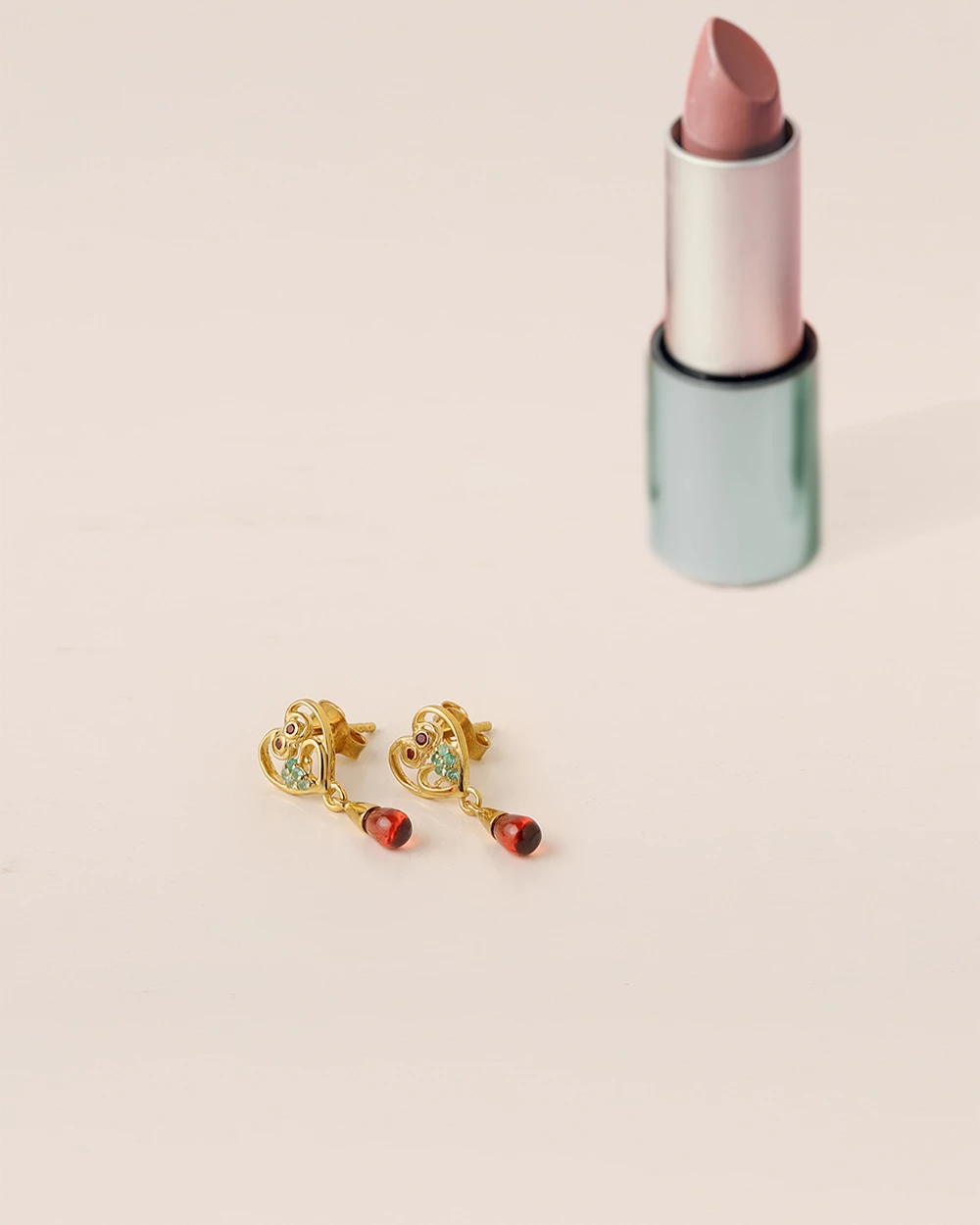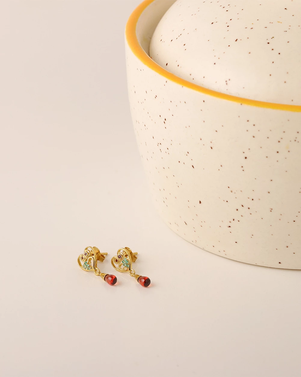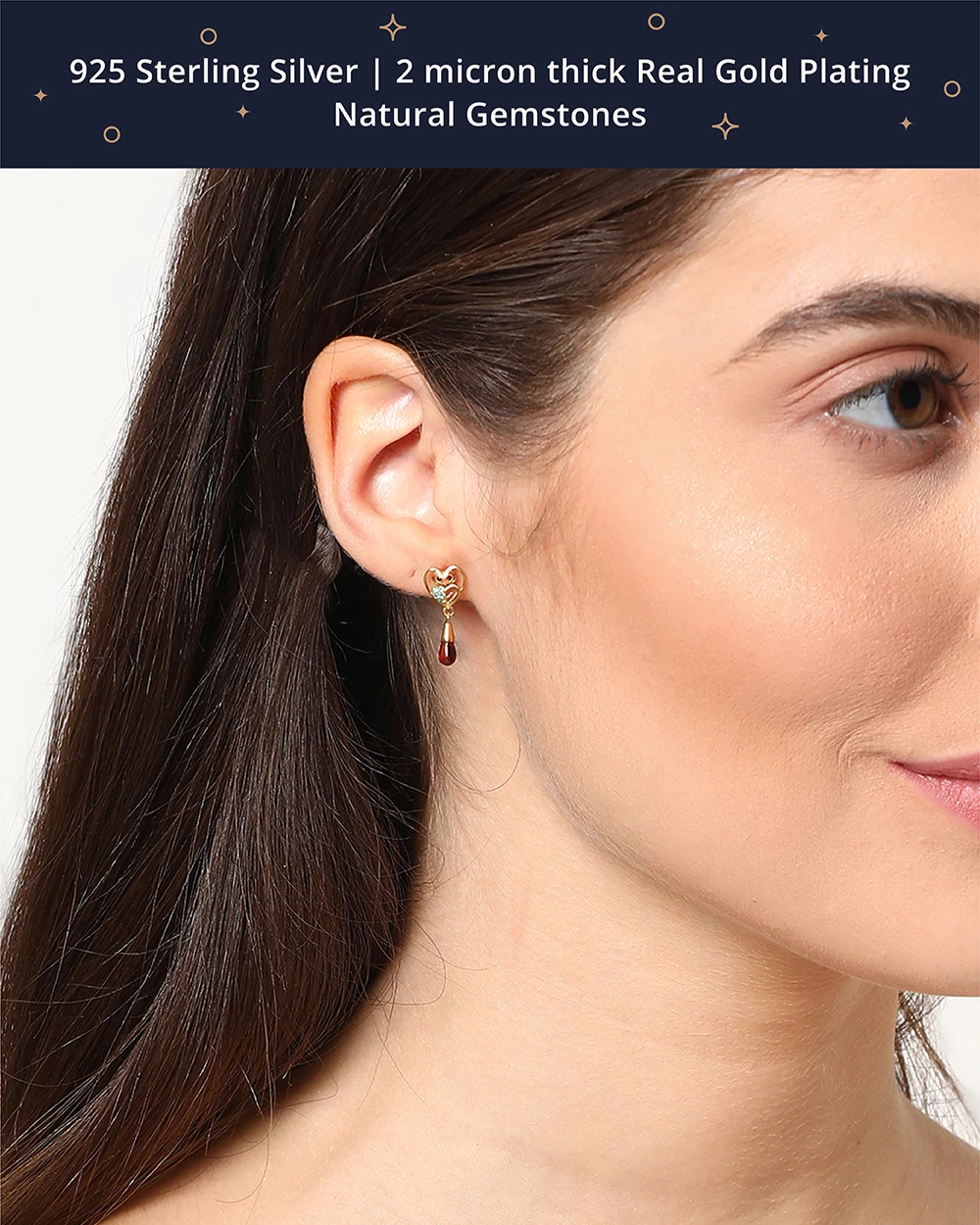 Our With Owl My Heart Tear Drop Earrings is a contemporary pair in a heart shape with owl motifs intricatedly carved in Red Garnet. Inspired by the magical inspiration of all times, our Owl mascot these Tear Drop earrings ith a dash of Victorian drama is a statement accessory. Pair it with the With Owl My Heart necklace to complete the look.