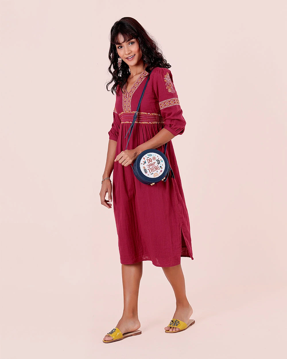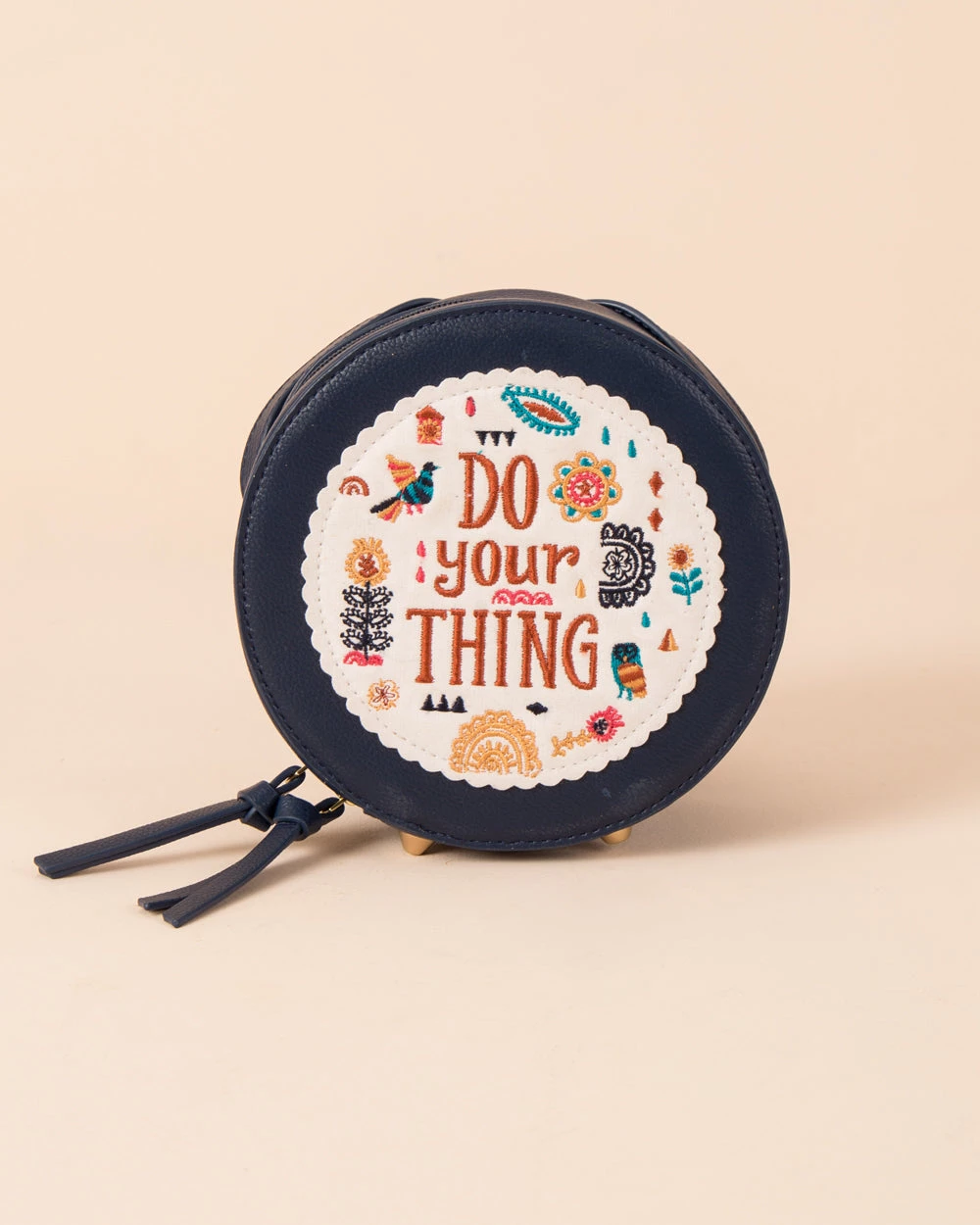 Add a pop of color to any outfit with the Your Own Thing Embroidered Navy Sling Bag. Made from PU and synthetic suede this bag comes with one main compartment with zip around closure and embroidered patch work on front.